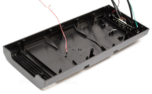Передняя пластиковая панель снимается со значительным усилием, хотя держится всего лишь на шести креплениях типа тюльпан. Снимать ее следует осторожно, без рывка, чтобы не повредить идущие к передним портам провода.
