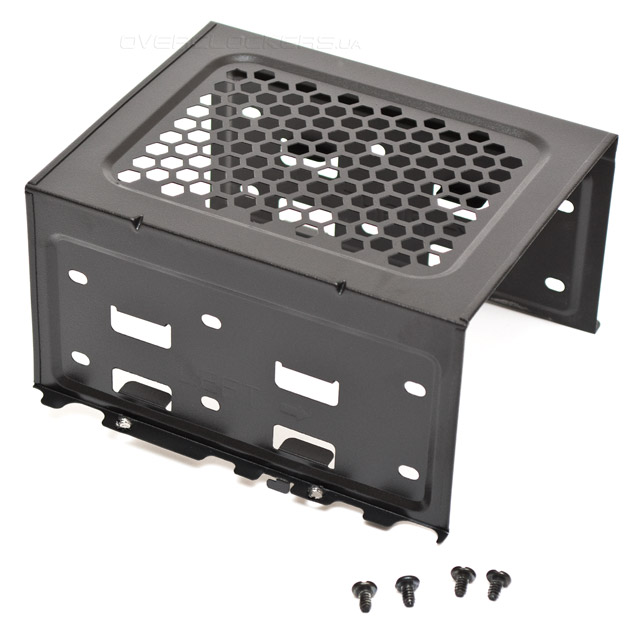 Корзина жестких дисков удерживается на раме корпуса двумя зацепами и четырьмя винтами. Снимается по направлению вверх.
