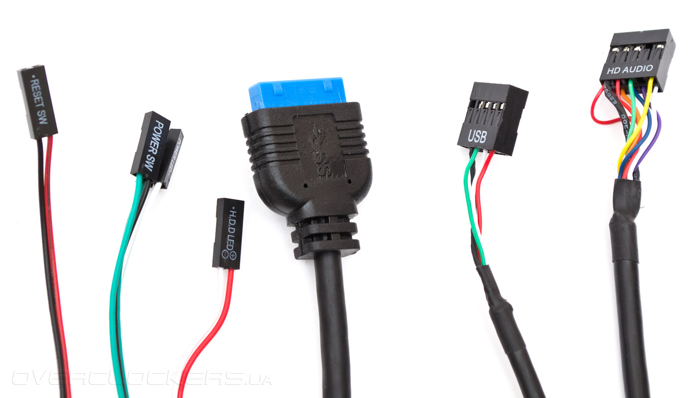 В набор проводов передней панели входят четыре провода от клавиш перезагрузки и запуска ПК, индикатора питания и светодиода активности накопителей, колодка внутреннего подключения USB 3.0, колодка USB 2.0 и кабель HD Audio. Длина всех шнуров достаточна для их протяжки за поддоном.