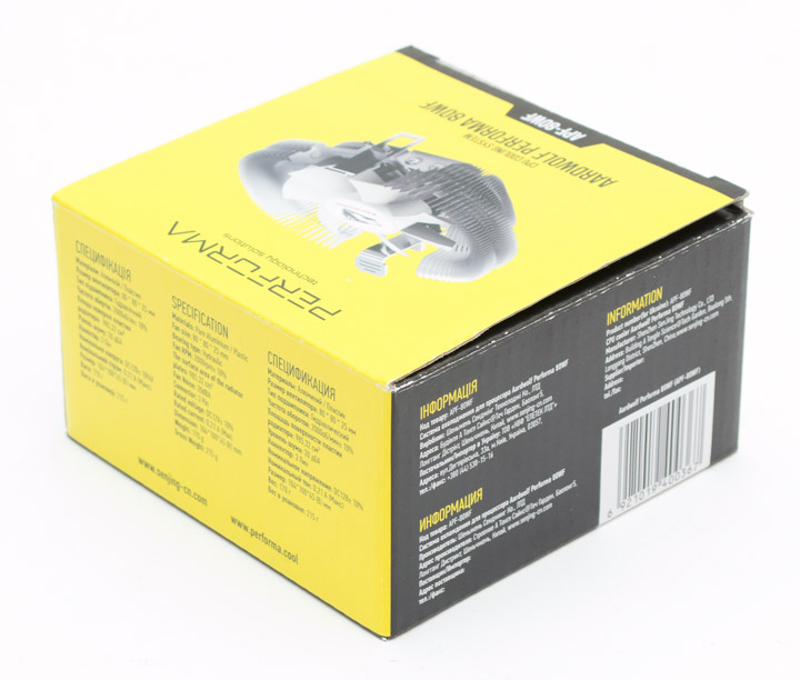 Коробка маленькая, выполнена в черно-желтых тонах, однако все необходимые технические характеристики на ней указаны, равно как и информация о совместимости с процессорными разъемами. Причем сразу на трех языках — украинском, русском и английском.