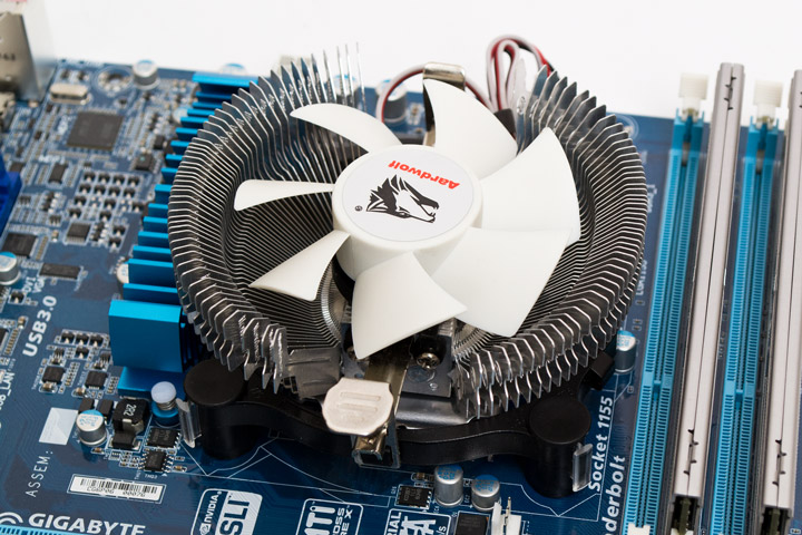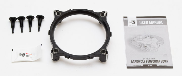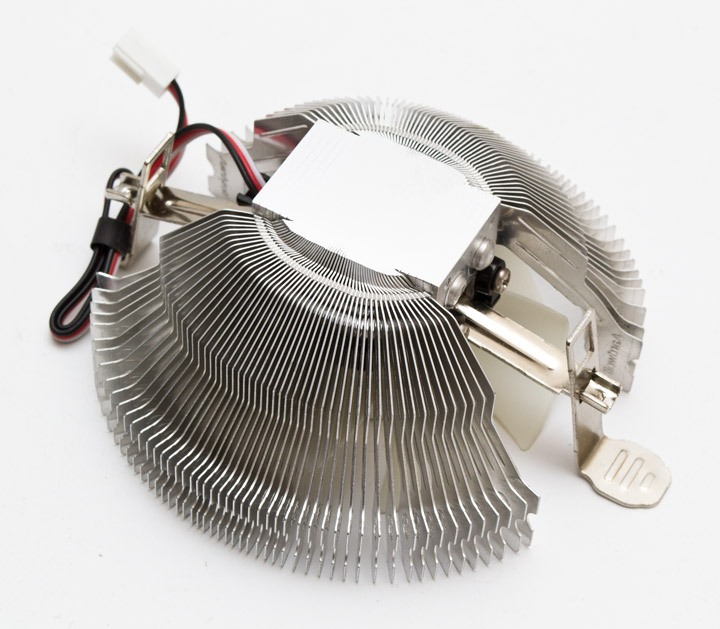 Конструктивно радиатор Performa 80WF представляет собой 102 алюминиевых ребра, расходящихся полукруглым веером от алюминиевого основания. В окружность ребер посередине посажен вентилятор белого цвета без рамки, обладающий постоянной скоростью вращения в 2200 об/мин и трех контактным подключением к питанию. Уровень его шума достигает 48 дБ (А), его будет слышно из закрытого корпуса, однако хотя бы тональность звучания пропеллера можно назвать ненавязчивой.