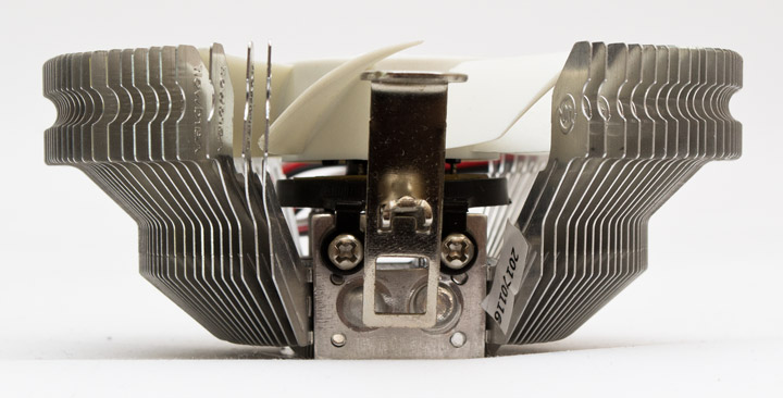 Основание ровное, неполированное, с четко различимыми радиальными следами от фрезы. По бокам основания видна два полушария, намекающие на наличие внутри камер с тепловыми трубками, но есть ли они там на самом деле, не представляется возможным проверить, а производитель о них не упоминает вообще. Поперечное коромысло крепления не имеет винтов и является обычной подпружиненной защелкой, которая подойдет по умолчанию на все стандартные рамки сокетов AMD.