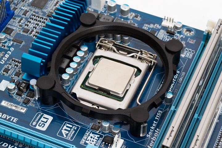 Performa 80WF можно установить на все сокеты AMD начиная с AM2 и на процессорные разъемы Intel LGA 115x и LGA775. Мы покажем монтаж на примере Intel LGA 1155. Все что требуется для установки — это выставить прозрачные вкладыши в рамке в положение 1156, раздвинув их в стороны до упора, затем вставить рамку в отверстия материнской платы, соблюдая желаемую ориентацию зацепов на ней. Потом вкладыши фиксируются на месте путем вставления в них шпилек до упора. Система крепления полностью аналогичная таковой на боксовом кулере.