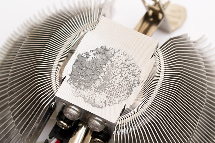 Отпечаток термопасты подтверждает то, что прижим слабый и неравномерный. Кроме того, по какой-то причине он получился еще и смещенным в сторону от центра.