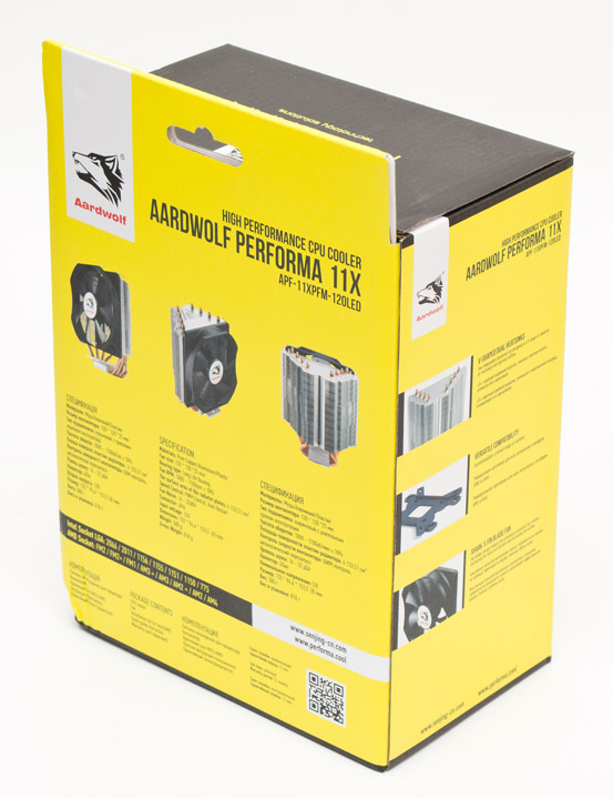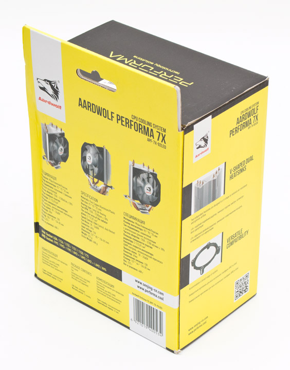 Коробка маленькая, выполнена в черно-желтых тонах, однако все необходимые технические характеристики на ней указаны, равно как и информация о совместимости с процессорными разъемами. Причем сразу на трех языках — украинском, русском и английском.