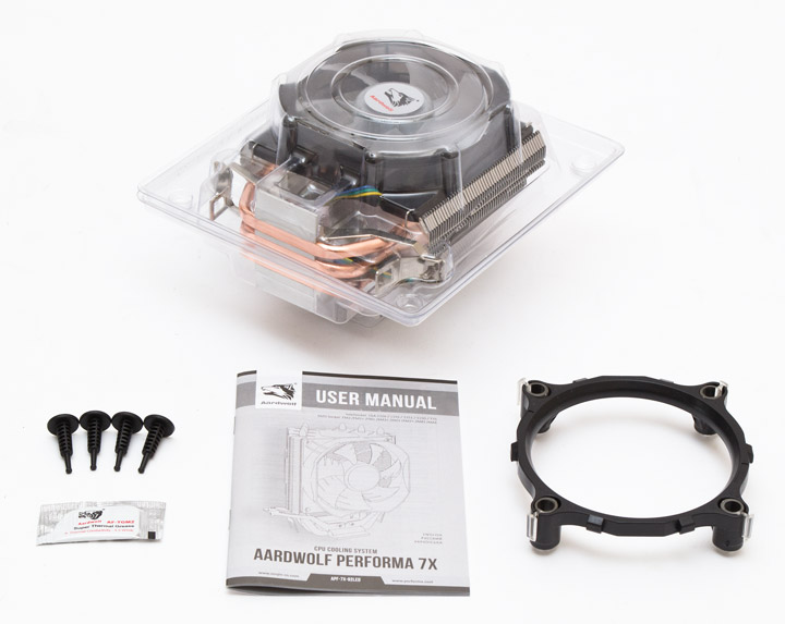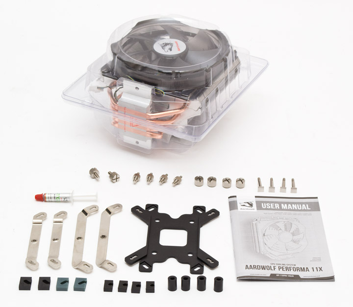 Кулер упакован внутри в многоразовый прозрачный пластиковый блистер. Комплект поставки идентичен Performa 10X, только с другой инструкцией.