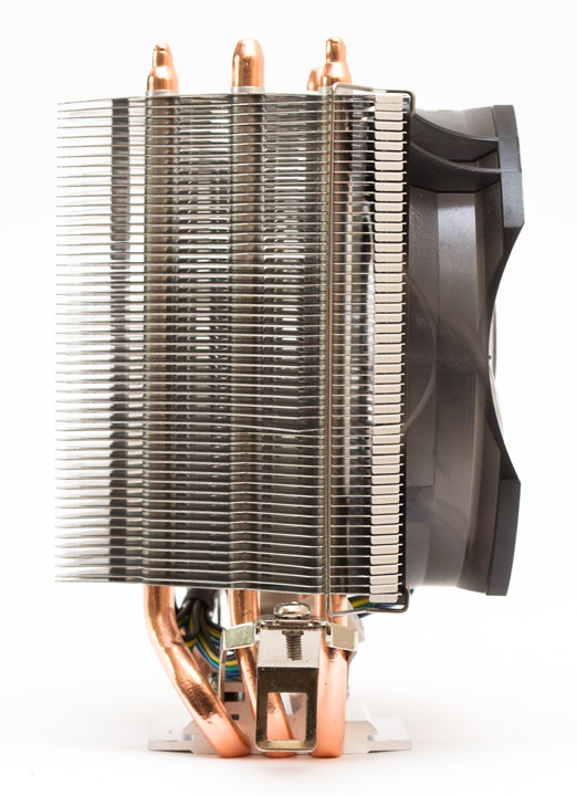 В центральный ряд отогнуты вторая и четвертая тепловые трубки, а центральная и две крайних вынесены на края радиатора. Количество ребер составляет 46 штук. Кстати, — это самый низкий кулер в линейке, его предельный габарит по высоте не превышает 151 мм.