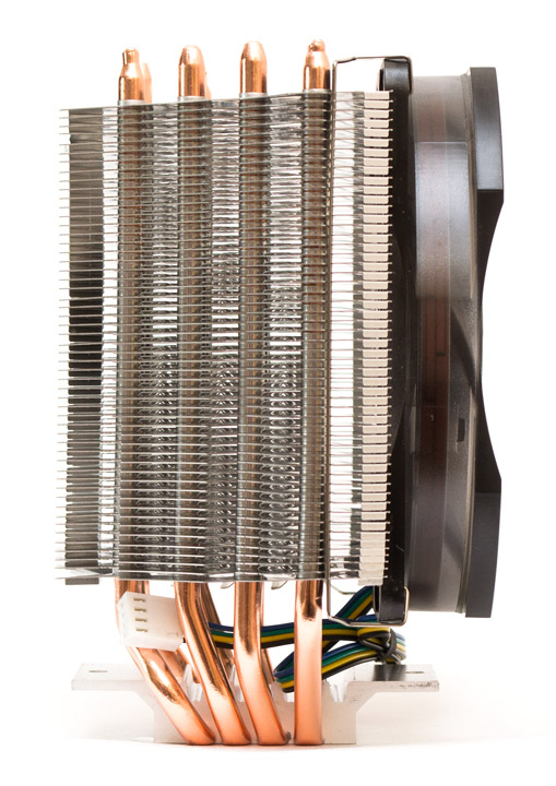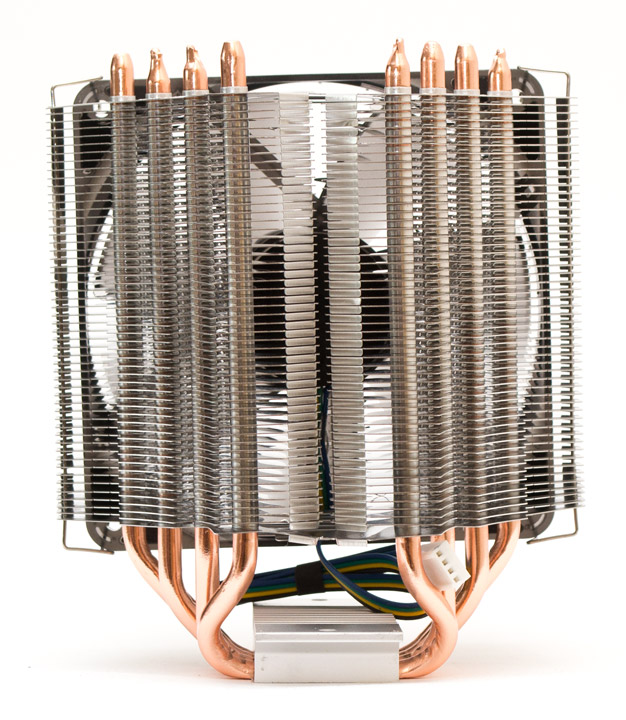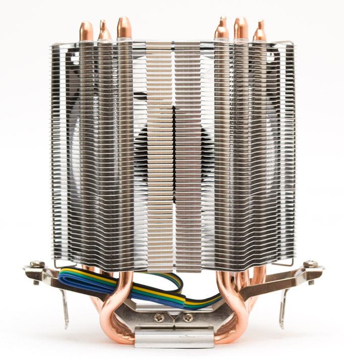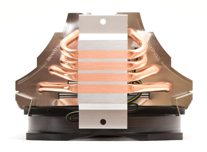 Четыре тепловые трубки и ребра во фронтальной проекции расположены достаточно плотно, чтобы их продуть, во внутренней камере потребуется поддерживать высокое статическое давление воздуха, что достигается только на повышенных оборотах вентилятора.