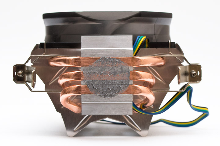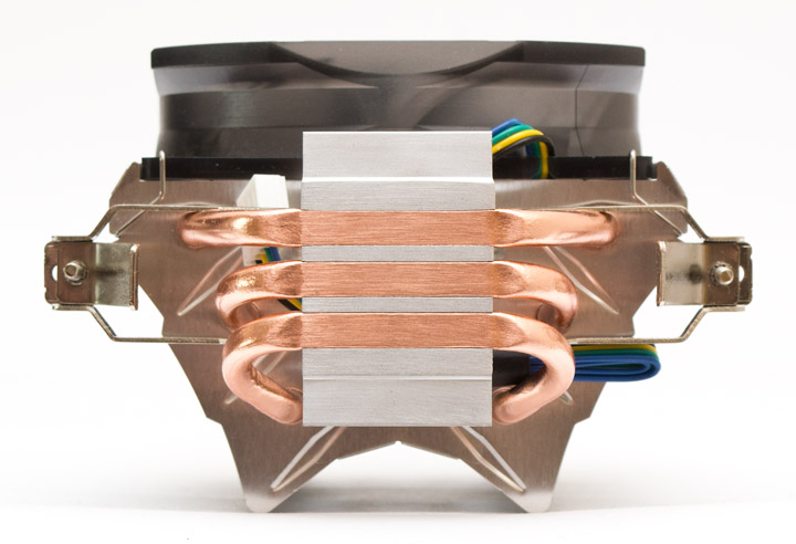 Тепловых трубок три, в радиаторе они правильно и равномерно разведены по сторонам. Количество ребер — 51 штука. Вентилятор крепится на скобах.