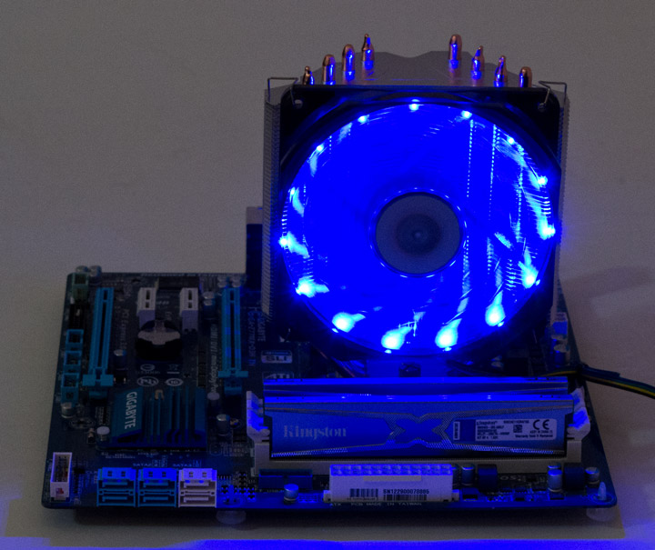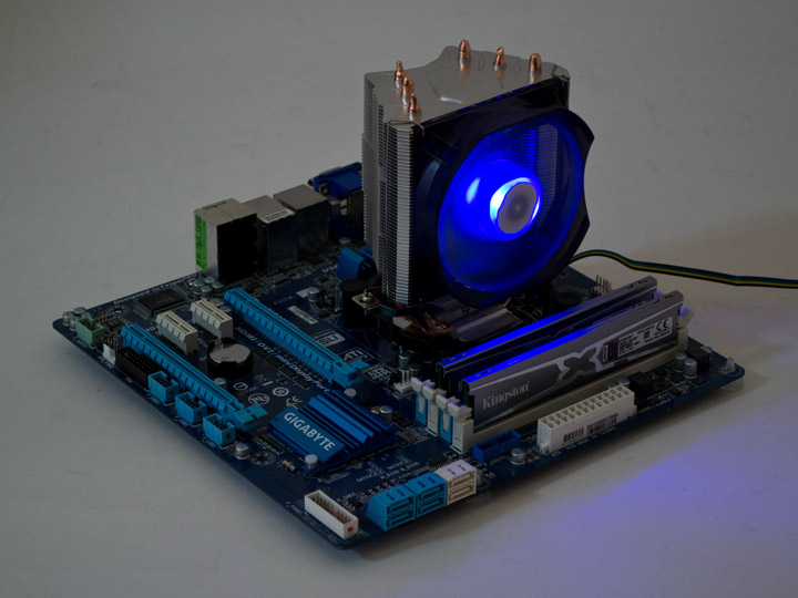 Осталось только надеть вентилятор на радиатор и подключить его к питанию. Вентилятор подсвечивается синим цветом с постоянной яркостью. Кулер в сборе не мешает слотам оперативной памяти.