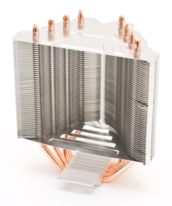 Радиаторные пластины имеют причудливую форму и такие же, как у Zalman-версии, аэродинамические оптимизации в виде невысоких скоб, сгруппированных по три штуки. Трубки расставлены в форме трапеции.