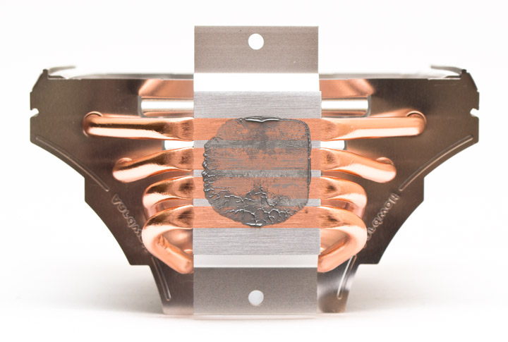 Основание прямого контакта хорошо обработано и отшлифовано, зазоры между тепловыми трубками небольшие. Отверстия для крепления кулера сделаны прямо в металлической прижимной пластине, которая удерживает трубки вместе.
