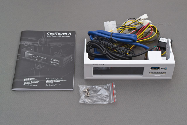 Цветной сенсорный экран размером 85х25 мм занимает большую половину панели. По форме CoolTouch-R полностью плоский и не имеет выступающих частей. Благодаря этому его легко можно установить в корпуса с плотно прилегающей к фронтальной панели дверцей. В розницу устройство продается в двух вариантах расцветки — черной и белой. Материал поверхности — приятный на ощупь пластик. Справа от экрана расположен один порт USB 3.0 и два слота кардридера, принимающего флэш-карты типа SD, MicroSD, MiniSD и MMC.