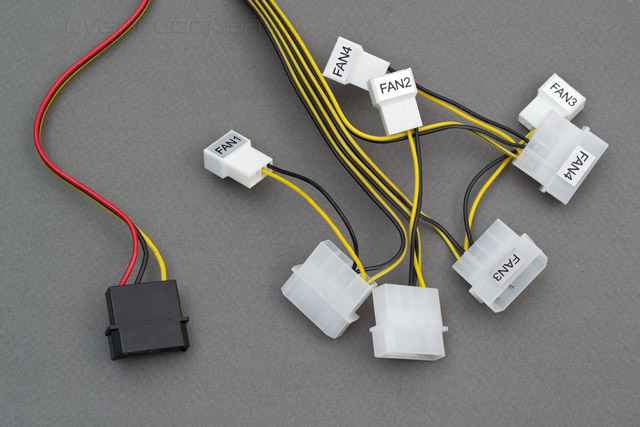 CoolTouch-R обладает высокой совместимостью со всеми типами разъемов питания вентиляторов. К нему можно присоединить трех- и четырехконтактные коннекторы, и еще на каждой линии есть встроенный переходник для разъемов «молекс» (к сожалению — не сквозных). Длина шнуров составляет 650 мм, каждый канал подписан, и пользователь точно будет знать, куда включен тот или иной пропеллер. «Молекс» черного цвета служит для подачи питания на саму панель.