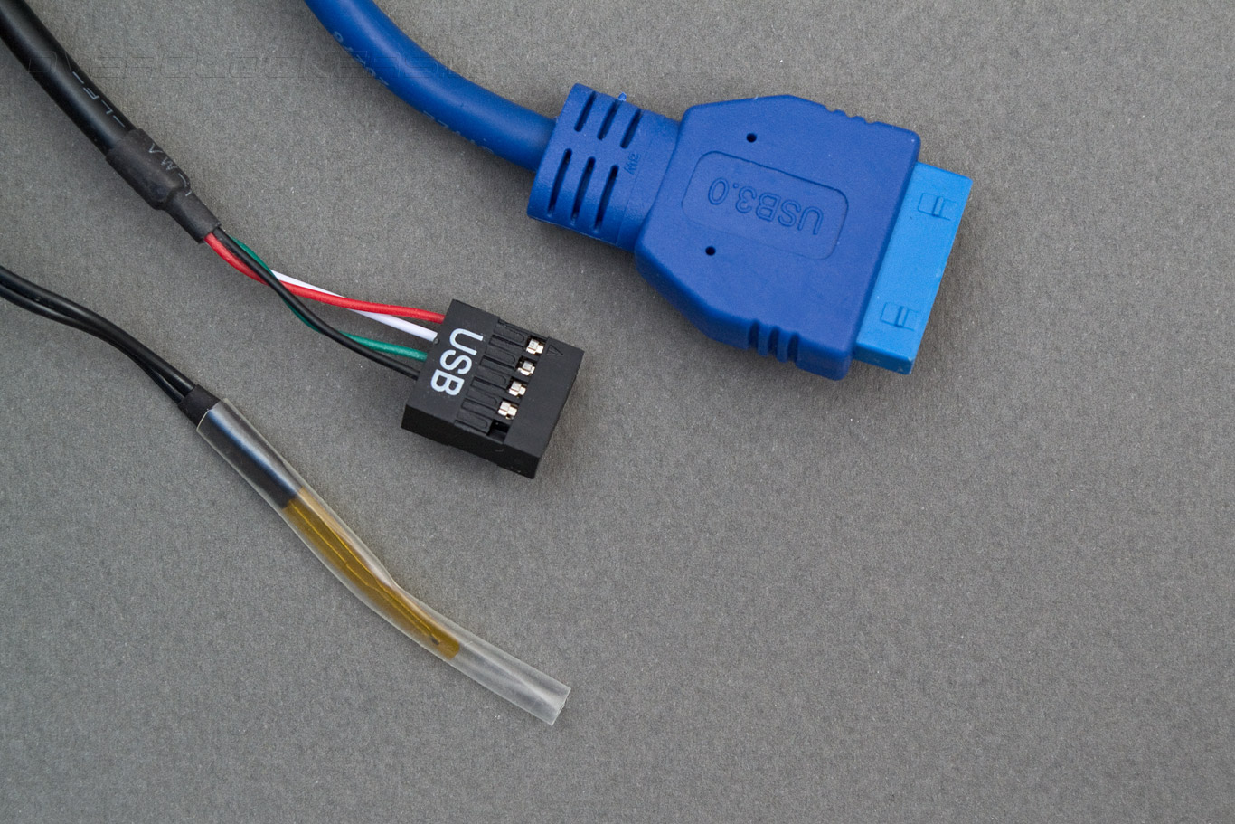 Для подключения USB 3.0 предусмотрена внутренняя колодка (длина кабеля — 700 мм). Шнур USB 2.0 (длина 750 мм) обеспечивает работу кардридера. А термодатчик (длина кабеля — 650 мм) измеряет температуру в том месте, куда пользователь соизволит его установить. К сожалению, в комплекте не обнаружилось липкой ленты для крепления этого датчика, хотя на официальном сайте о ней упоминалось.