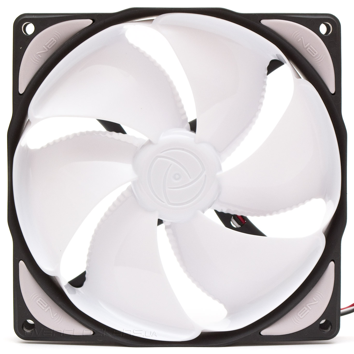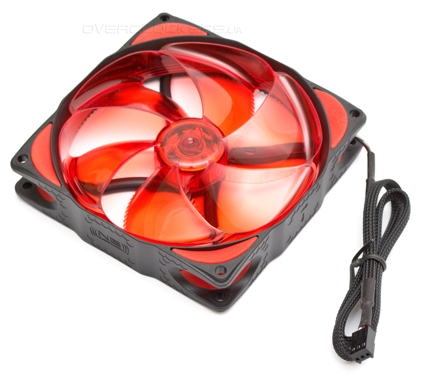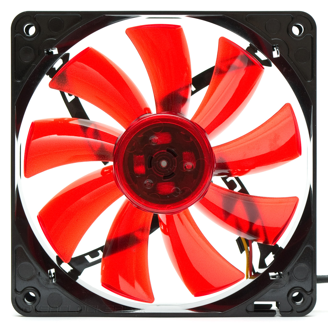 Обычный с виду, но обладающий рядом интересных особенностей пропеллер. Красная крыльчатка с девятью лопастями снимается — достаточно просто ее отщелкнуть. Для вентилятора декларируется способность работать при частичном погружении в воду. Это должно привлечь владельцев СВО, однако жизнеспособность вентиляторов, наверное, будет интересовать их в последнюю очередь в случае протечки жидкостного контура. В акустическом отношении Phobya Nano-G12 ведет себя аномально. Его хорошо слышно во всем диапазоне оборотов, но шум не является раздражающим. При работе на 8 В уровень шума резко подскакивает вверх с 42 до 47 дБ (А), однако при переходе на 9 В, шум снижается до 46 дБ (А). Старт происходит при 5 В и 900 об/мин, максимальная скорость достигает 1500 об/мин. Подшипник по номенклатуре Phobya обозначается как Nanoflux. По сути это втулка скольжения с магнитным центрированием оси.