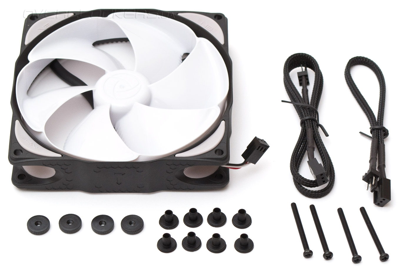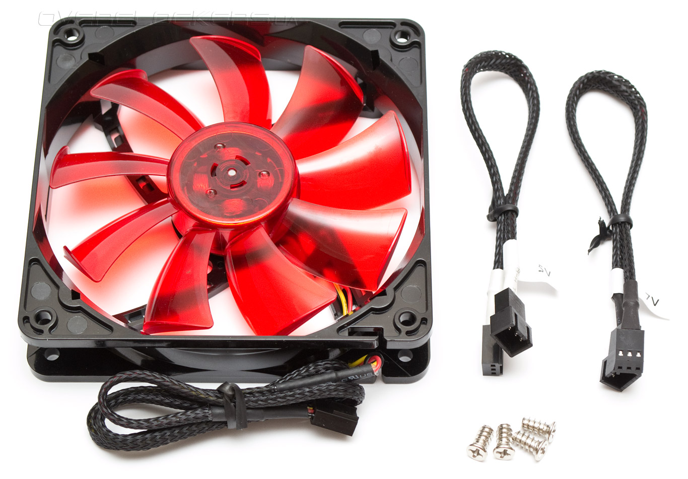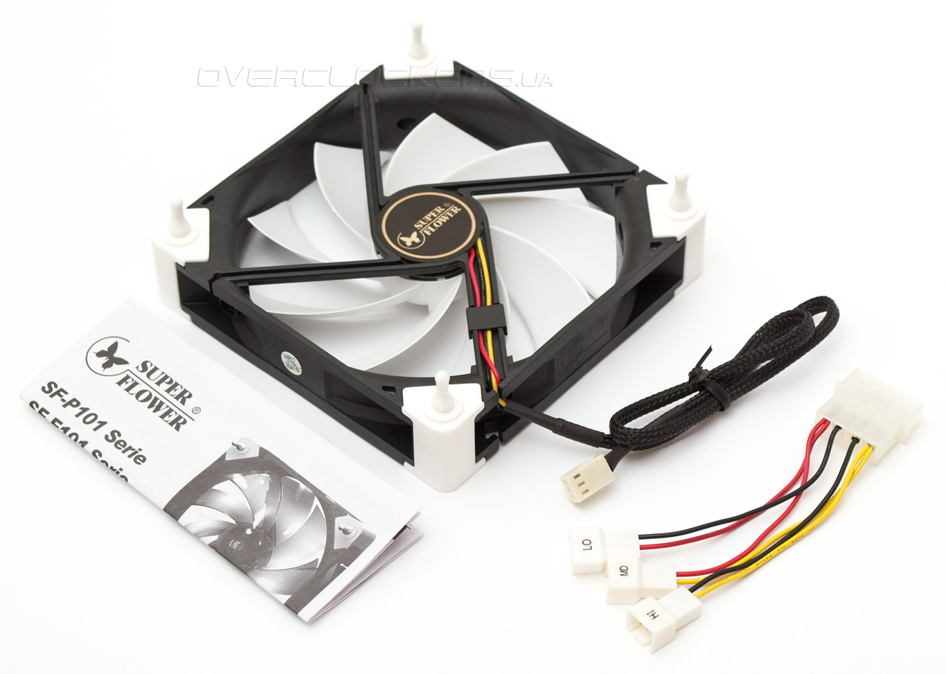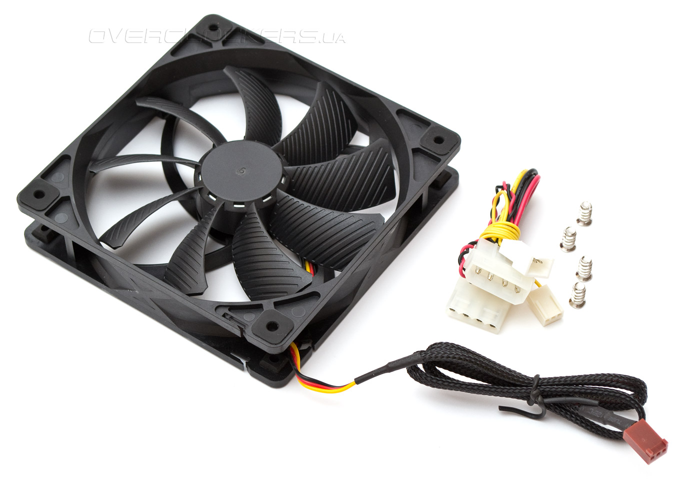 В комплект поставки включены четыре шурупа-самореза и переходник с «молекса» на трехконтактный разъем с отдельным проводом для подключения тахометра. Шнур питания длиной 500 мм облагорожен нейлоновой оплеткой.