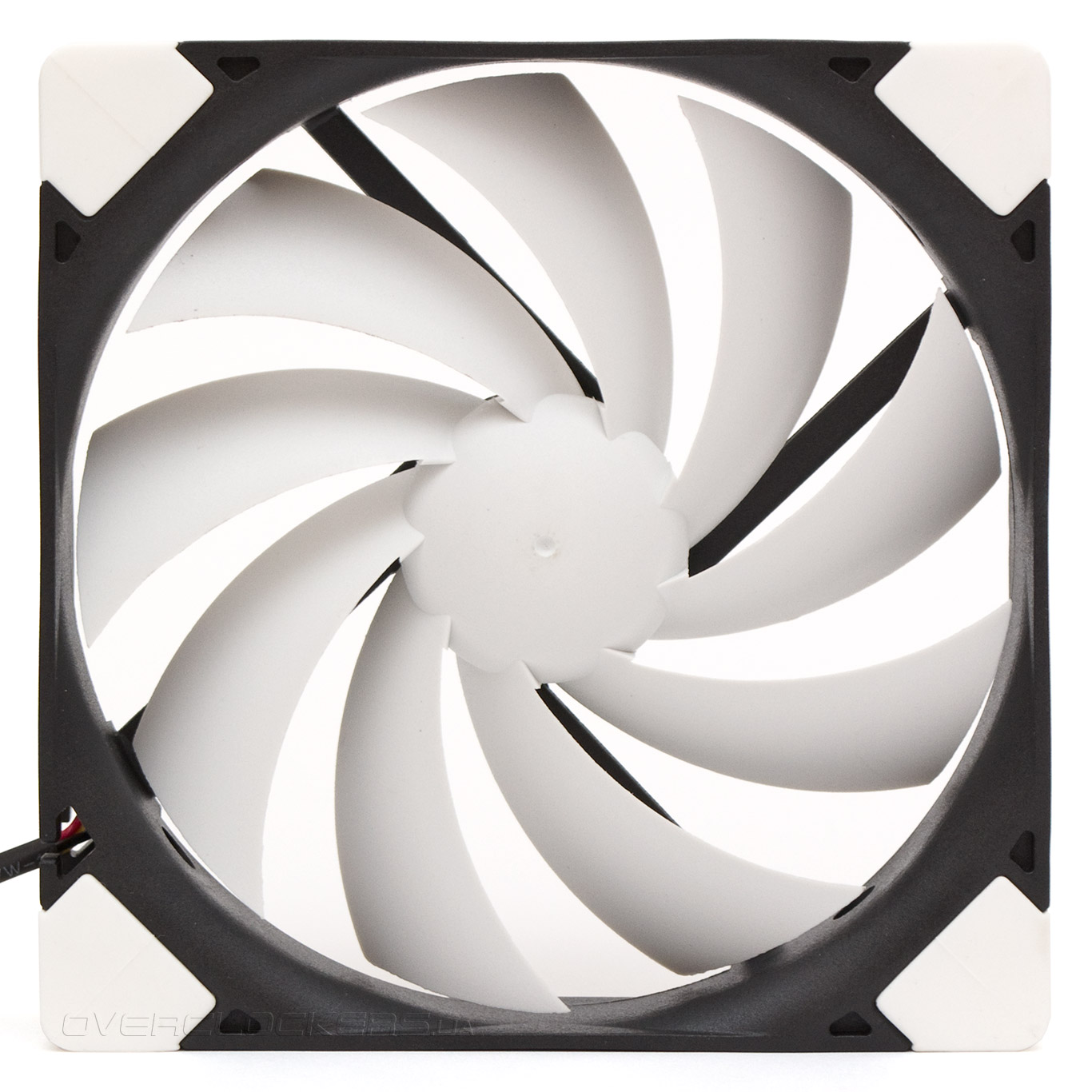 Вентилятор Super Flower — это редкий гость на нашем рынке. Внешний вид отдаленно напоминает изделия Arctic. Интересной особенностью является закругленная, а не плоская, как обычно, шляпка ротора. Еще больший интерес представляет используемый подшипник, обозначенный как Duro bearing. Мы так и не смогли найти схему, достоверно поясняющую принцип его работы, однако склоняемся к мысли, что это очередная разновидность самосмазывающейся втулки. Работает подшипник вполне сносно, несмотря на плохую балансировку вибрации отсутствуют, а призвуки мотора различимы только с очень близкого расстояния. С другой стороны, аэродинамический шум слышен уже с 800 об/мин. Крыльчатка стартует с 3 В и 500 об/мин, предел по скорости составляет 1200 об/мин. Вентилятор можно считать тихим до 8 В и 1000 об/мин.