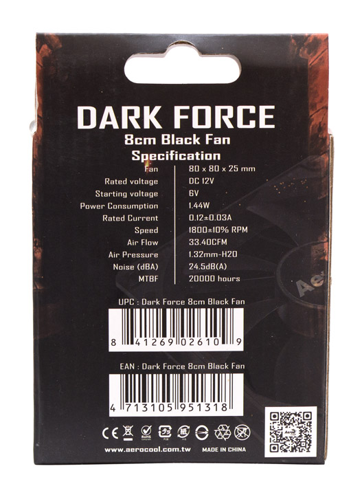 Самый маленький в линейке 80-мм вентилятор может пригодиться владельцам старых корпусов. Поставляется в картонной коробке, изображения на фронтальной стороне которой явно навеяны игрой Doom, или чем-то подобным. С обратной стороны приведены технические характеристики.