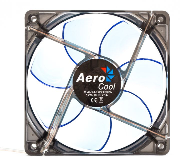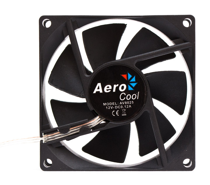 По форме это более чем стандартный вентилятор с обычной рамкой, типоразмера 80х80х25 мм. На крыльчатке есть семь маленьких лопастей привычной конфигурации и наклейка с логотипом бренда. Изоляция кабеля питания прозрачная, его длина составляет 460 мм до трехконтактного разъема и еще 50 мм до «молекса».