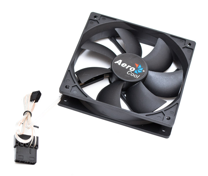 Рамка и крыльчатка вентилятора полностью стандартные — семь лопастей с обычным наклоном, без ухищрений и «улучшающих» аэродинамику модификаций. Изоляция кабеля питания прозрачная, длина составляет 440 мм до трехконтактного разъема и еще 50 мм до «молекса».
