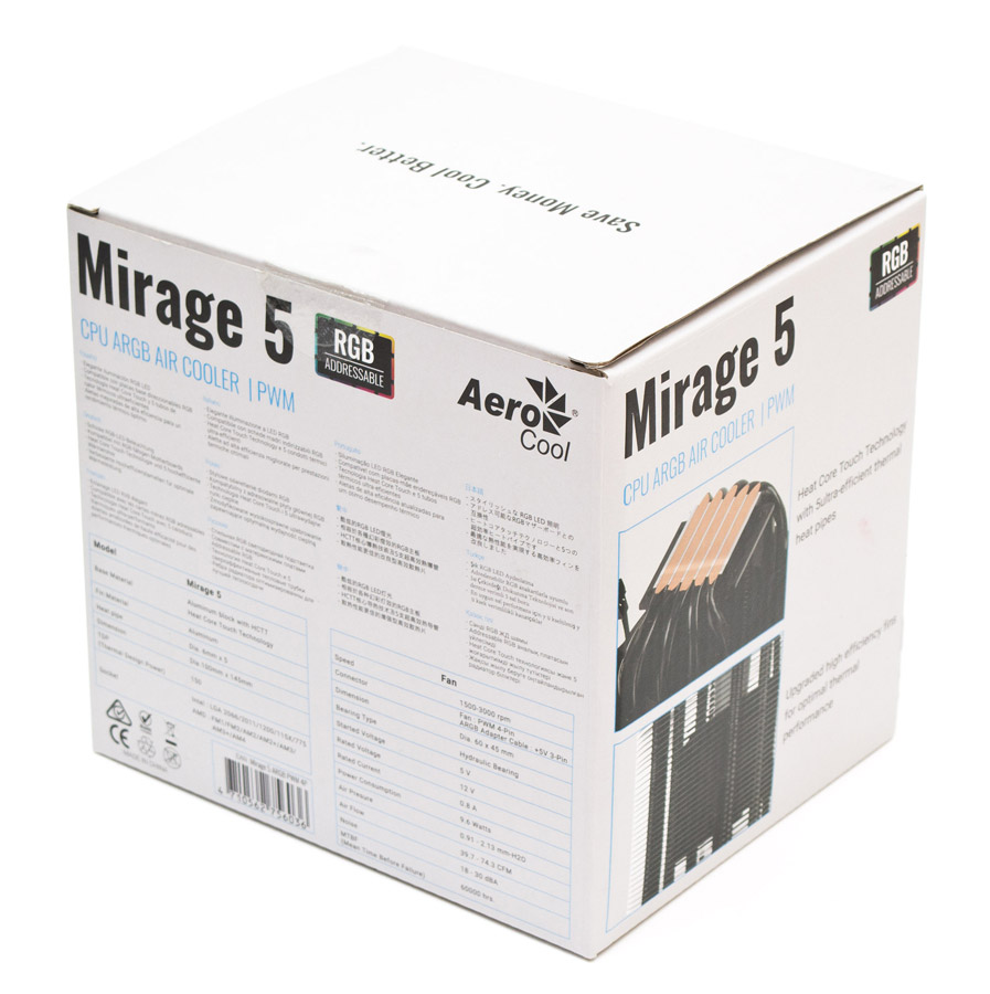 Aerocool Mirage 5 имеет цилиндрическую форму радиатора, благодаря чему его дизайн выглядит самобытно. Модели аналогичного вида на самом деле можно пересчитать на пальцах одной руки. Специфический центробежный вентилятор установлен вертикально внутри кольцеобразных ребер. Пять 6-мм тепловых трубок расположены вокруг него спереди и сзади в ряд. Сверху все это накрыто пластиковой крышкой со встроенным в верхнюю панель стеклянным зеркалом. Кулер полностью окрашен краской в черный цвет за исключением подошвы. В общем сделано все весьма и весьма оригинально.