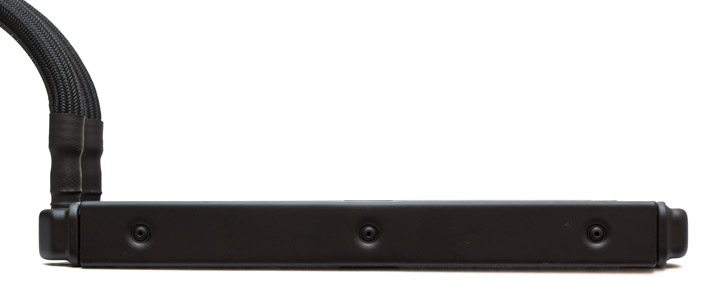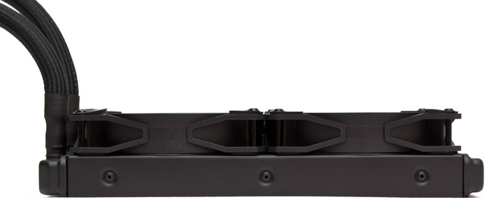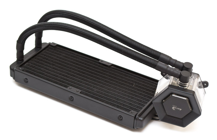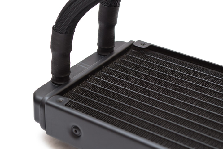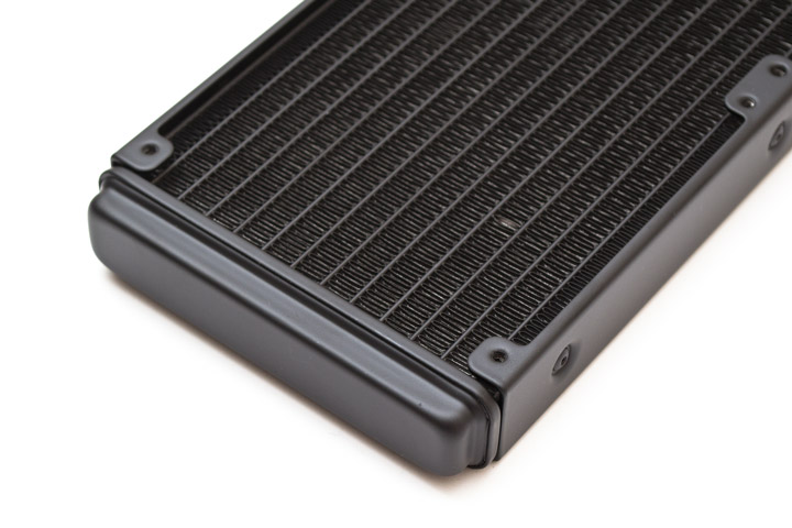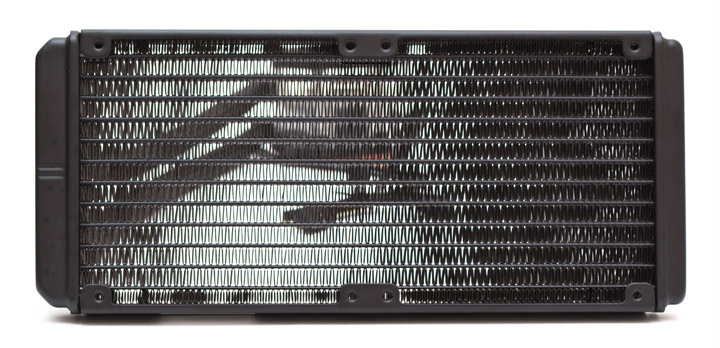 Радиатор сделан из алюминия, имеет два набора крепежных отверстий для 120-мм вентиляторов, расположенных вплотную. Ребра радиатора ленточного типа, набраны с плотностью в 18 FPI (пластин на дюйм). Каналов, через которые прокачивается хладагент, тут насчитывается 14 штук. Суммарная площадь рассеивания тепла составляет порядка 6 000 см2, что является средним показателем для этого класса систем. Вес снаряженной системы без вентиляторов — 926 грамм.