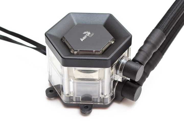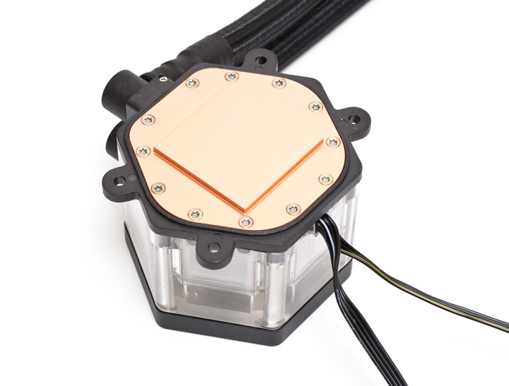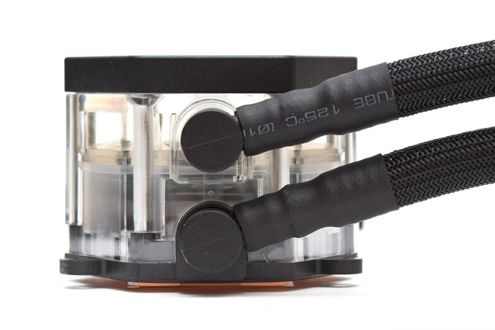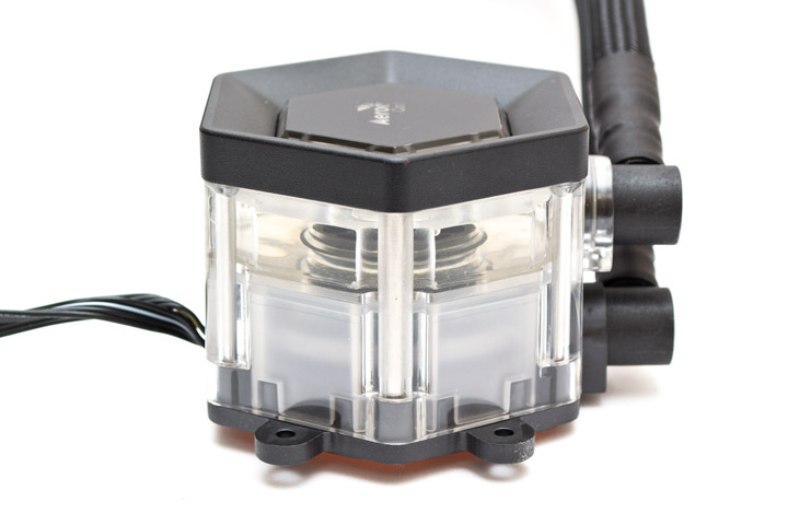 Внутри водоблок двухкамерный. В верхней камере находится резервуар емкостью приблизительно в 100 мл, туда поступает жидкость из радиатора. В нижней камере расположена помпа, туда хладагент проходит через центральное отверстие, затем омывает основание и уносит тепло к радиатору через нижнюю трубку. Общий объем жидкости в системе, по заверению производителя, составляет 250 мл.