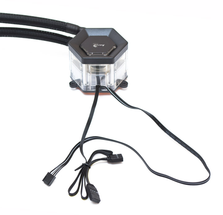 Встроенная помпа имеет керамический подшипник с прогнозируемым сроком наработки на отказ в 80000 часов. Ее разъем подключения четырехконтактный, а значит скоростью можно управлять при помощи ШИМ. Провод без оплетки, длиной 480 мм. Максимальная заявленная скорость работы двигателя составляет 2500 об/мин. В нашем случае, судя по показаниям датчика, скорость вращения составляла 2600 об/мин при уровне шума в 42 дБ (А). С одной стороны это и немного, но паразитный призвук в виде тарахтения был хорошо различим на слух. Неразличимым из корпуса он становится на 1800 об/мин, а бесшумности помпа достигает на 1500 об/мин. Дополнительно стоит учесть, что громкость этого устройства зависит не только от скорости, но и от количества воздуха в контуре. А при ШИМ управлении нужно убедиться, что обороты помпы превышают стартовые, чтобы избежать внезапного закипания жидкости. От водоблока отходит и кабель управления подсветкой. Он без оплетки, имеет длину в 480 мм до разъема «мама» на четыре контакта 12VGRB и еще 60 мм до «папы», чьи контакты закрыты крышечкой.