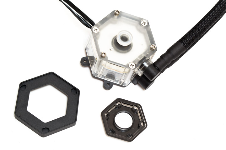 Зато водоблок выглядит весьма необычно. Он имеет шестиугольную форму, и большая часть корпуса выполнена из прозрачного акрила. Верхняя крышка у него двухсоставная. Центральная ее часть пластиковая, а обод металлический.