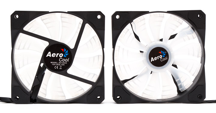 Два комплектных вентилятора формата 120х120х25 мм относятся к уже знакомой нам серии P7-F12 с RGB-подсветкой, однако отличаются от них максимальной скоростью в 1800 об/мин и ШИМ-управлением. Правда, в нашем варианте они разгонялись максимум до 1700 об/мин при суммарном уровне шума в 62 дБ (А). На 1000 об/мин получалось порядка 45 дБ (А) — все еще слышно, но уже умеренно. При 800 об/мин шум опускался до 42 дБ (А), что уже практически не слышно из закрытого корпуса. Стартовые обороты составляют 600 в минуту.