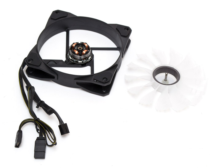 По углам рамки наклеены резиновые демпферы с обеих сторон. Крыльчатка снимается, хотя и с заметным усилием. Подшипник гидравлический. Шнур подключения к питанию четырехконтактный, без оплетки, длиной в 430 мм. Кабель 12VGRB тоже обходится без оплетки, имеет длину в 450 мм до разъема «мама» еще 55 мм до «папы».