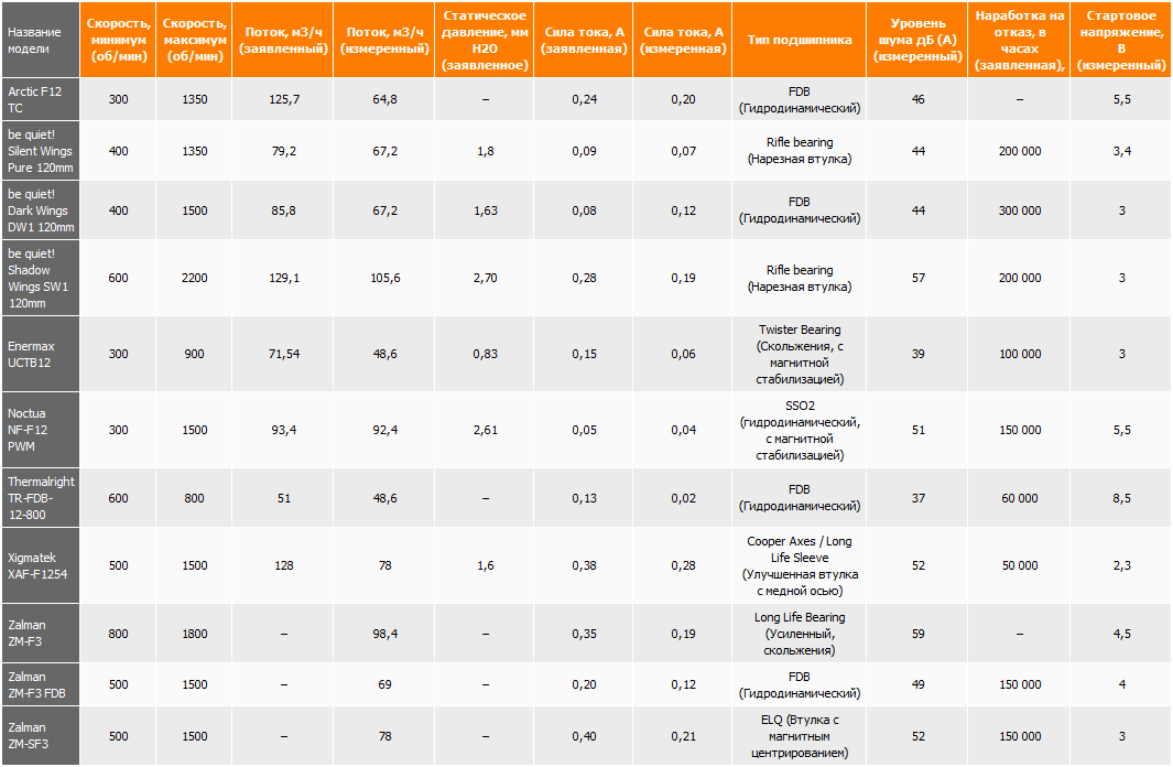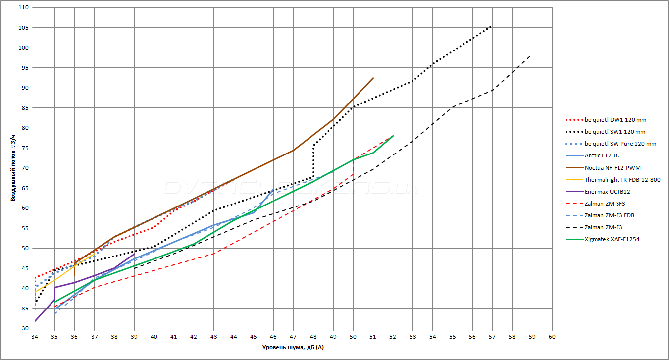 Приступим к толкованию полученных результатов. Лучшими по сочетанию шума/производительности оказались вентиляторы Noctua NF-F12 PWM, be quiet! Silent Wings Pure 120mm и be quiet! Dark Wings DW1 120mm.