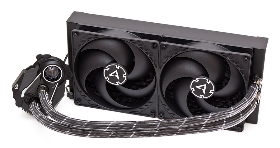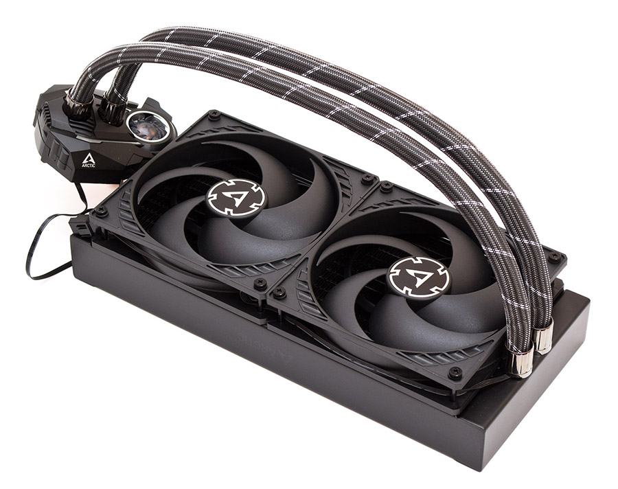 Внешность Arctic Liquid Freezer II 280 выглядит внушительно за счет сочетания массивного радиатора и крупноразмерных вентиляторов. Матовый черный цвет покраски, квадратные углы, широкие шланги в очень мягкой узорчатой оплетке, никелированные обоймы фитингов, все это производит впечатление солидности. Система не требует дополнительных манипуляций после извлечения из коробки, всё уже идет в сборе, вентиляторы прикручены на свое место и подключены. Ставите ее в корпус, монтируете водоблок на процессор, включаете единственный кабель питания и все готово к работе. Шланги средней гибкости имеют длину в 450 мм, внешний диаметр в 12,4 мм и внутренний в 6 мм. Оплетка выполняет в большей мере декоративную, чем защитную функцию. Под ней вдоль трубок проложен кабель питания вентиляторов, заходящий напрямую в водоблок.