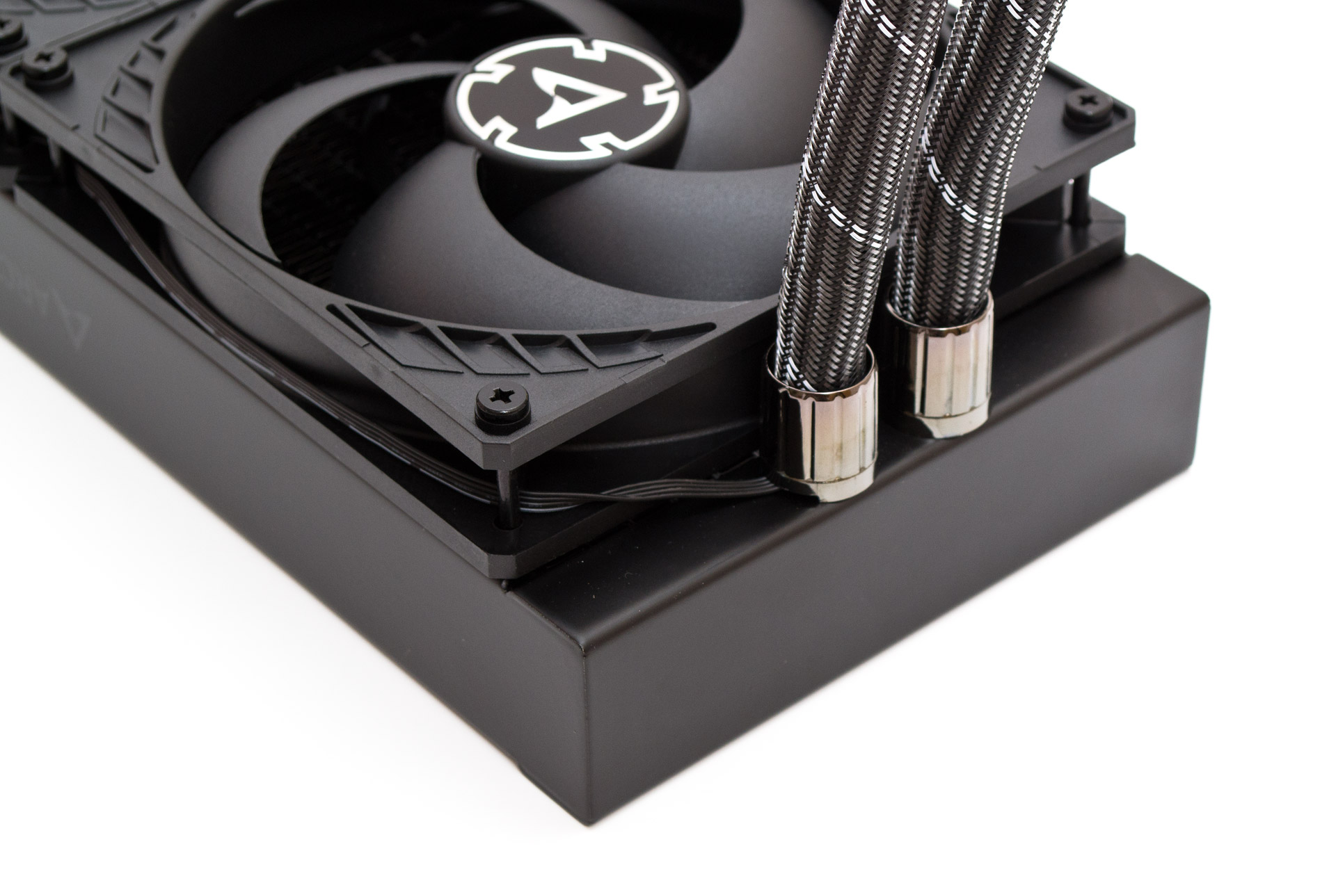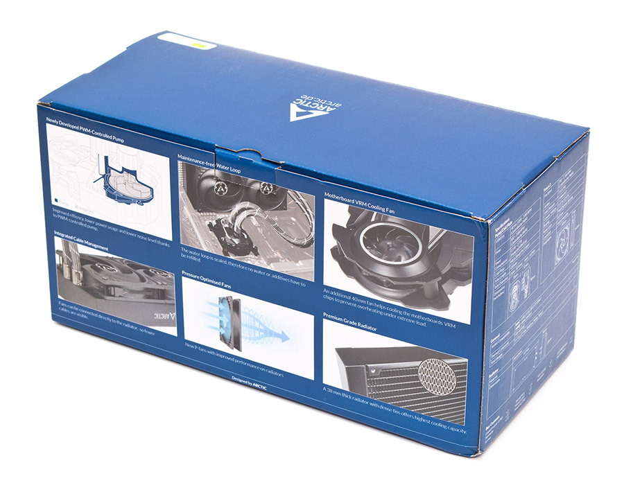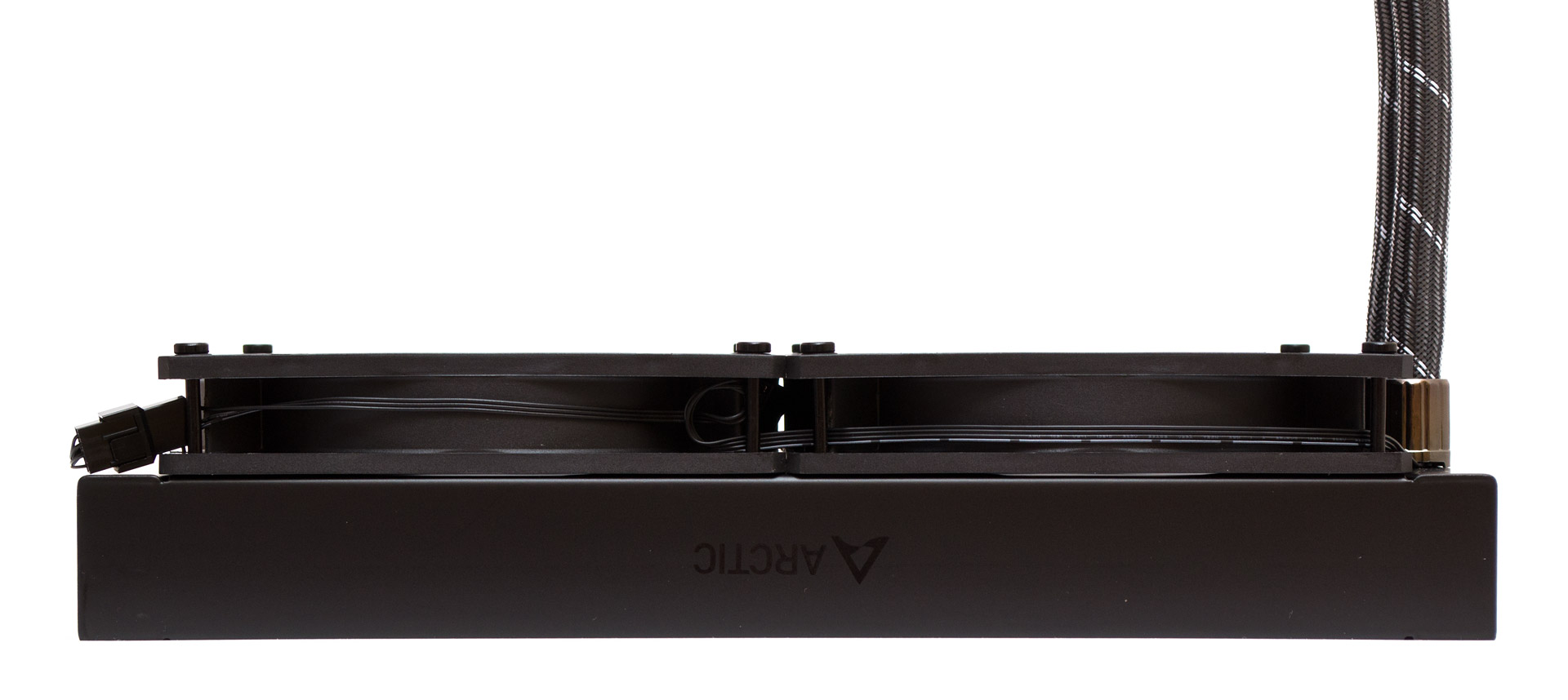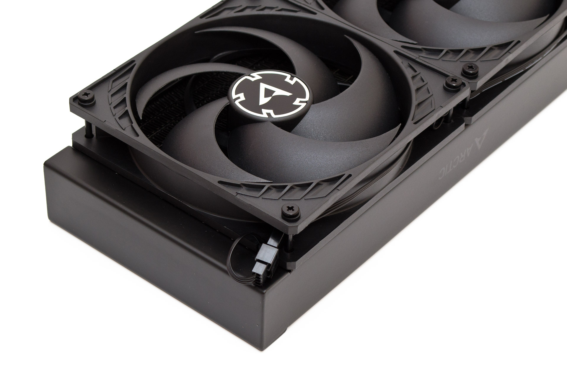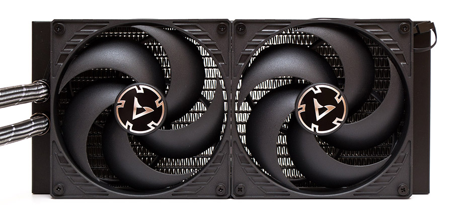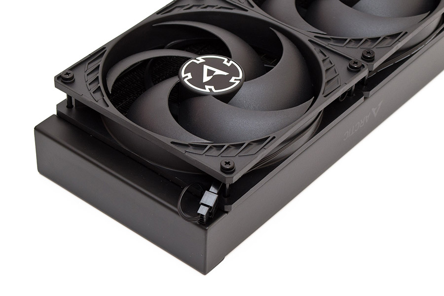 С обеих сторон радиатора, на цельных боковинах присутствует малозаметная надпись Arctic с логотипом перед ней. Обратите внимание, что радиатор в профиль имеет толщину 38 мм. В сборе с вентиляторами и винтами суммарная толщина достигает 68 мм, потому стоит осторожно выбирать корпус под эту СЖО, чтобы избежать неожиданных конфликтов с другими компонентами.
