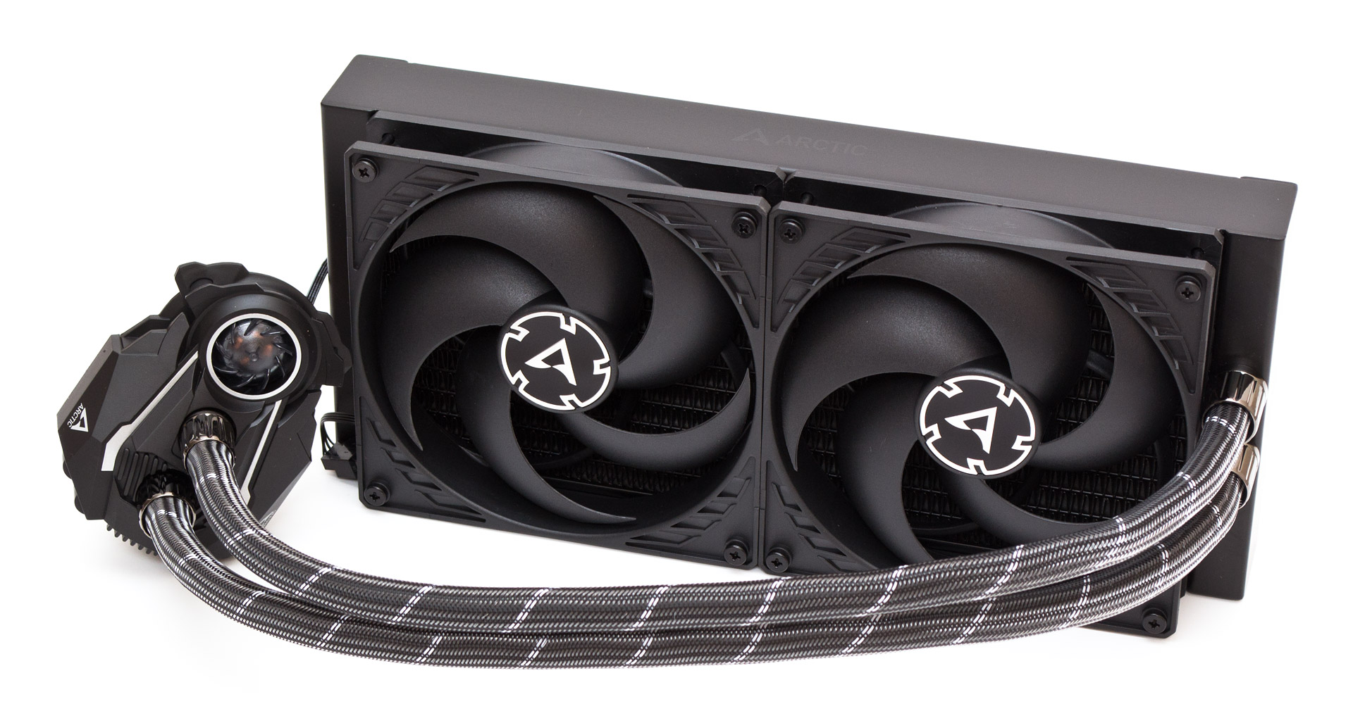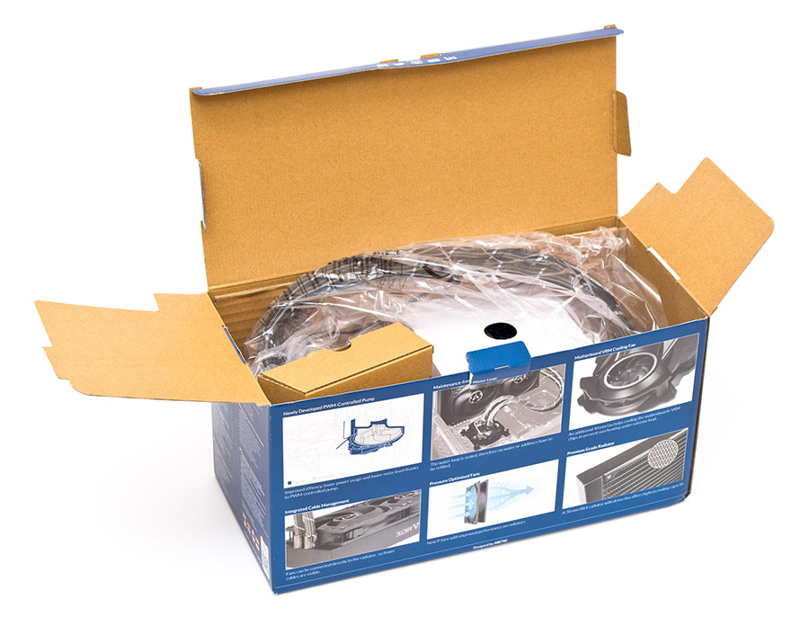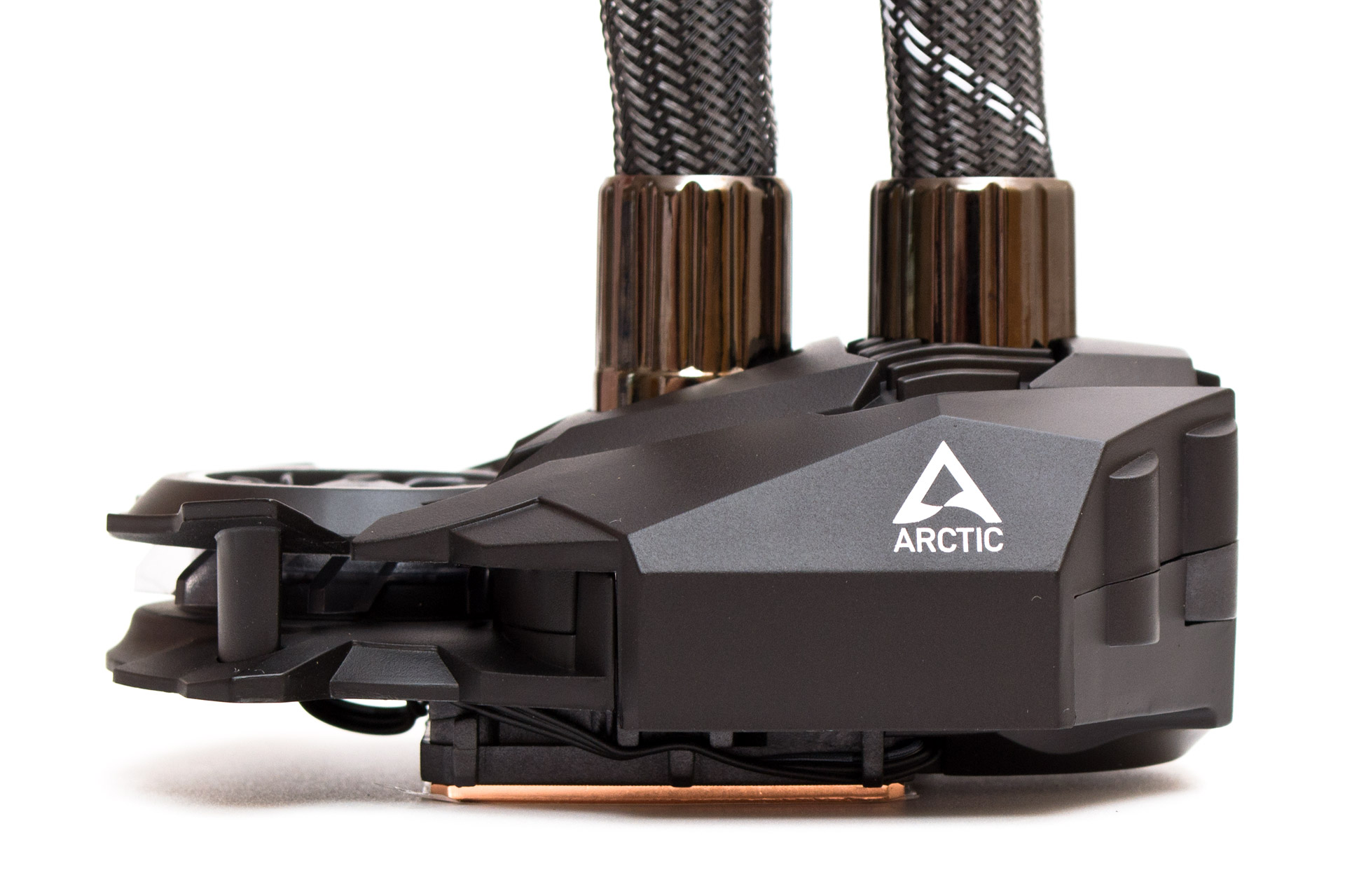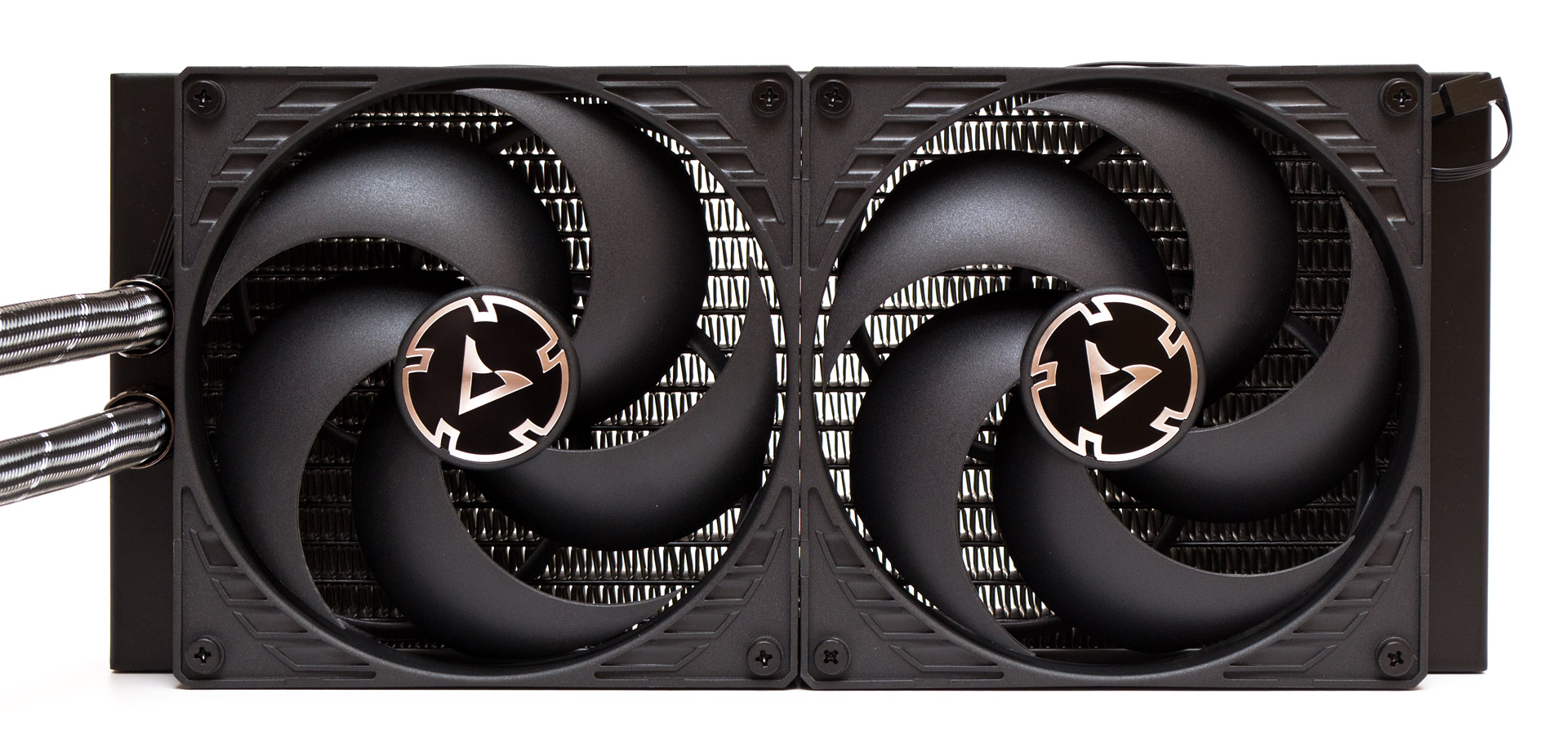 С обеих сторон радиатора, на цельных боковинах присутствует малозаметная надпись Arctic с логотипом перед ней. Обратите внимание, что радиатор в профиль имеет толщину 38 мм. В сборе с вентиляторами и винтами суммарная толщина достигает 68 мм, потому стоит осторожно выбирать корпус под эту СЖО, чтобы избежать неожиданных конфликтов с другими компонентами.