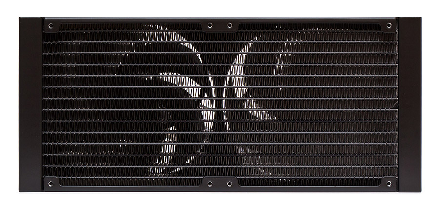 Двухсекционный радиатор имеет габариты 317х138х38 мм. В боковых ламелях есть два набора крепежных отверстий для 140-мм вентиляторов, расположенных без зазора. Ребра ленточного типа изготовлены с плотностью расположения в 14 FPI (пластин на дюйм). Между ребрами проходят 14 каналов, через которые прокачивается хладагент.