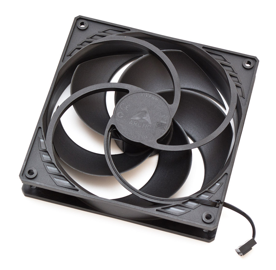 Два установленных тут вентилятора крепятся длинными винтами без прокладок. Они представляют собой классическую модель Arctic P14 PWM, сделанную на базе гидродинамического подшипника и обладающую всего пятью длинными и изогнутыми лопастями. Диапазон скоростей составляет от 200 до 1700 об/мин и управляется при помощи ШИМ. Лопасти, двигатель и подшипник не имеют паразитных призвуков на всех скоростях и ведут себя достаточно тихо. Короткий четырехконтактный кабель питания подключается в общий разветвитель.