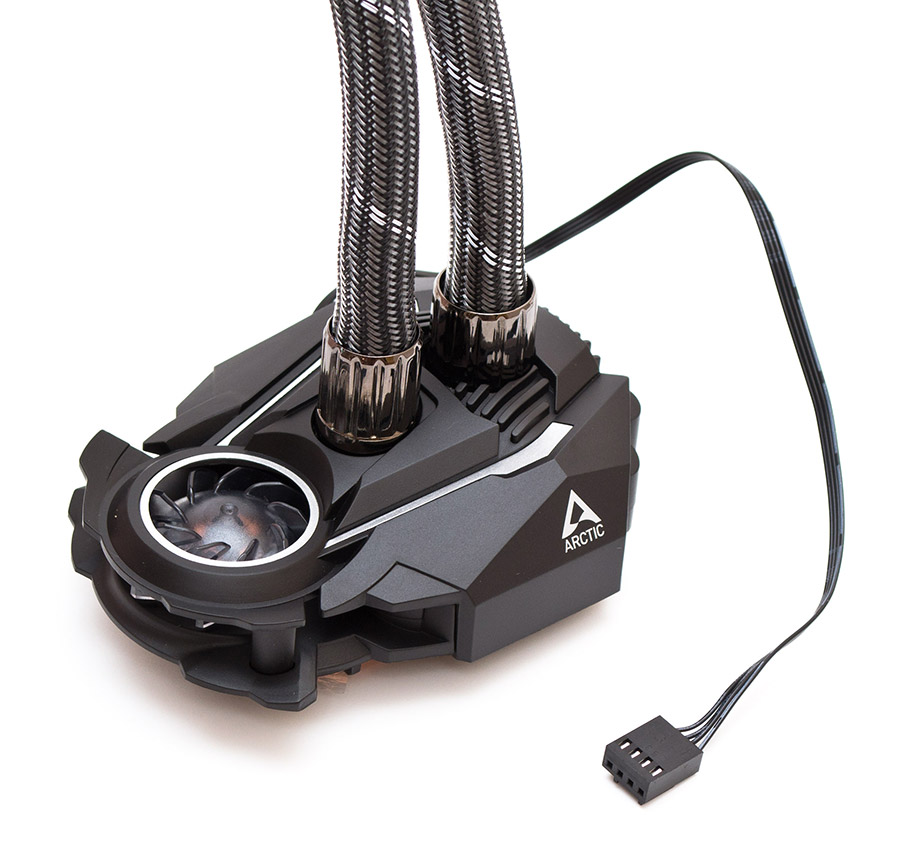 Пластиковый водоблок имеет интересную многогранную форму. Шланги заходят в него сверху и закреплены неподвижно. В передней его части встроен вентилятор для обдува цепей питания. Питается два вентилятора, помпа и дополнительный пропеллер через один общий четырехконтактный кабель длиной в 260 мм, который подключается в разъем CPU Fan материнской платы. На разъем мониторинга выводится только скорость двух «главных» пропеллеров.