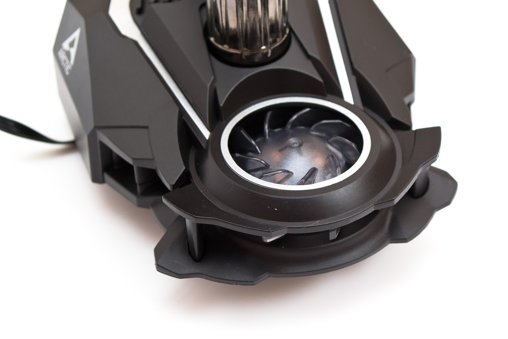 Вентилятор помпы центробежного типа, диаметром 40 мм. Забирает воздух сверху и расталкивает в стороны, в радиусе 180 градусов. Его скорость управляется при помощи ШИМ в диапазоне от 1000 до 3000 об/мин. И если на минимуме он практически неразличим, то на полной скорости его уровень шума достигает 48 дБ (А), что заметно даже на фоне основных 140-мм пропеллеров.