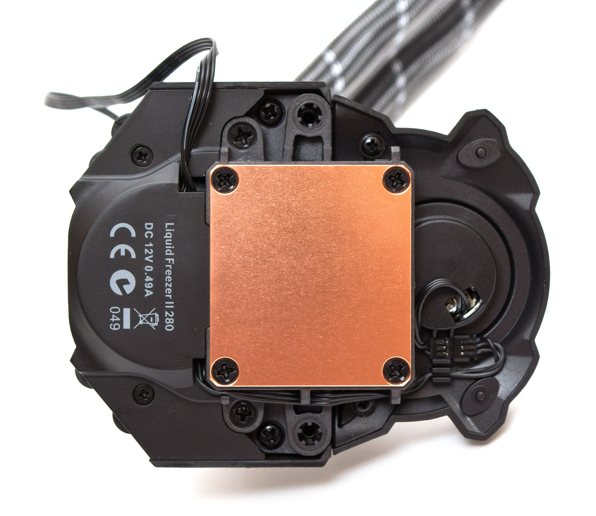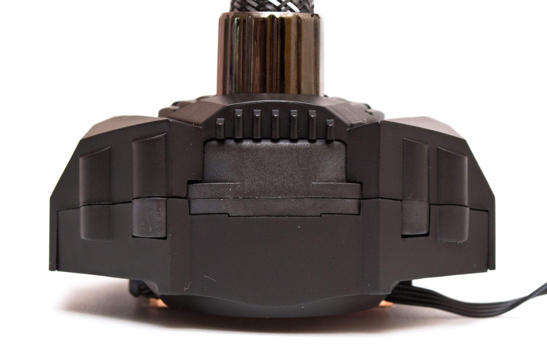 Ровная медная подошва имеет приближенную к квадратной форму со скругленными углами размером 40х44 мм. По углам находится всего четыре крепежных винта со стандартной крестовой шляпкой. Вдоль основания проложен провод подключения вентилятора цепей питания.