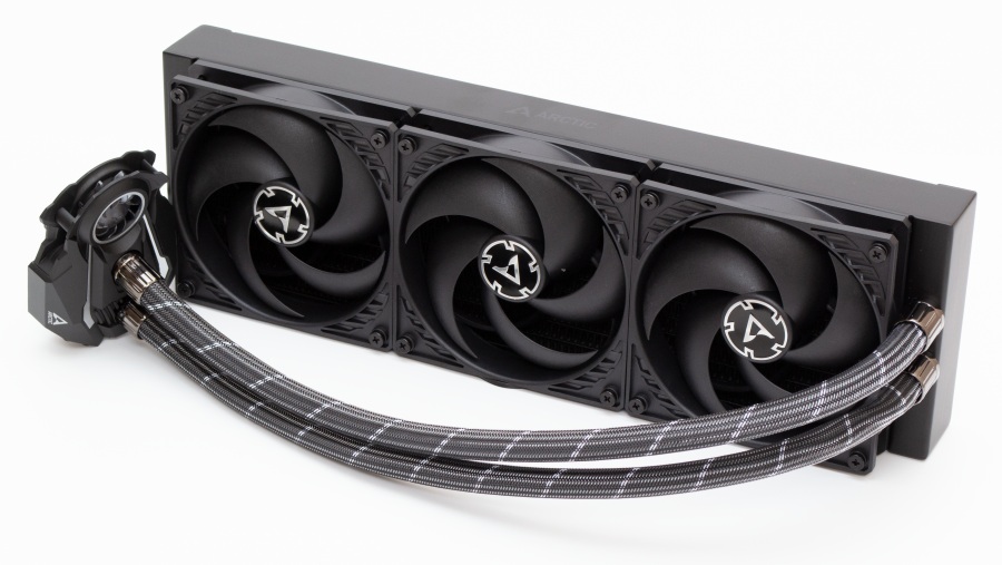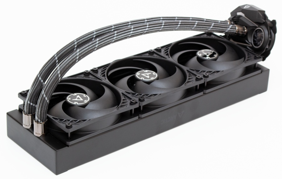 Хотя конфигурация основных компонентов у Arctic Liquid Freezer II 360 стандартная, в целом система выглядит внушительно. Крупный и толстый радиатор с квадратными углами, широкие шланги в очень мягкой узорчатой оплетке, никелированные обоймы фитингов, все это производит впечатление солидности. Кроме того, система не требует дополнительных манипуляций после извлечения из коробки, всё уже идет в сборе, вентиляторы прикручены на свое место и подключены. Ставите ее в корпус, монтируете водоблок на процессор, включаете единственный кабель питания и все готово к работе. Шланги средней гибкости имеют длину в 450 мм, внешний диаметр в 12,4 мм и внутренний в 6 мм. Оплетка выполняет в большей мере декоративную, чем защитную функцию. Зато между ней и трубками проложен кабель питания вентиляторов, заходящий напрямую в водоблок.