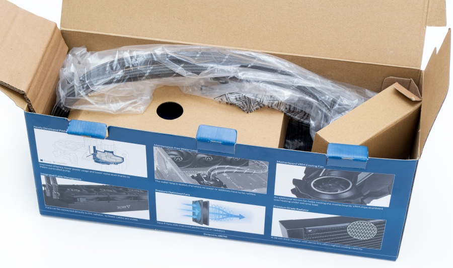 Внутри упаковочных элементов тоже не густо. Картонная накладка на водоблок, одна прокладка и коробка между радиатором и шлангами, в которой прячется комплект поставки. Вот, собственно, и все.