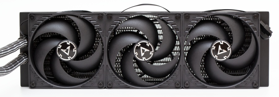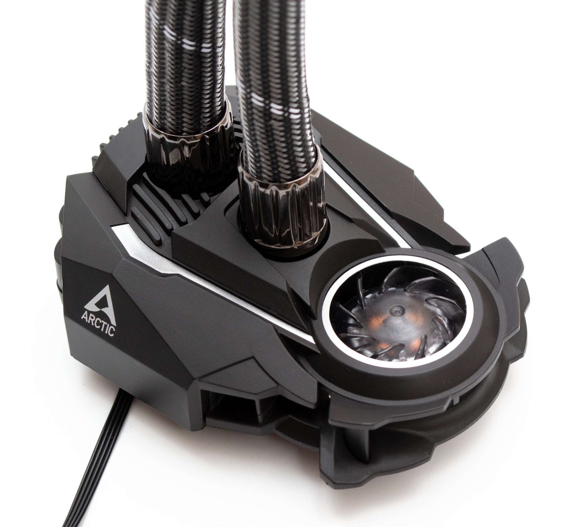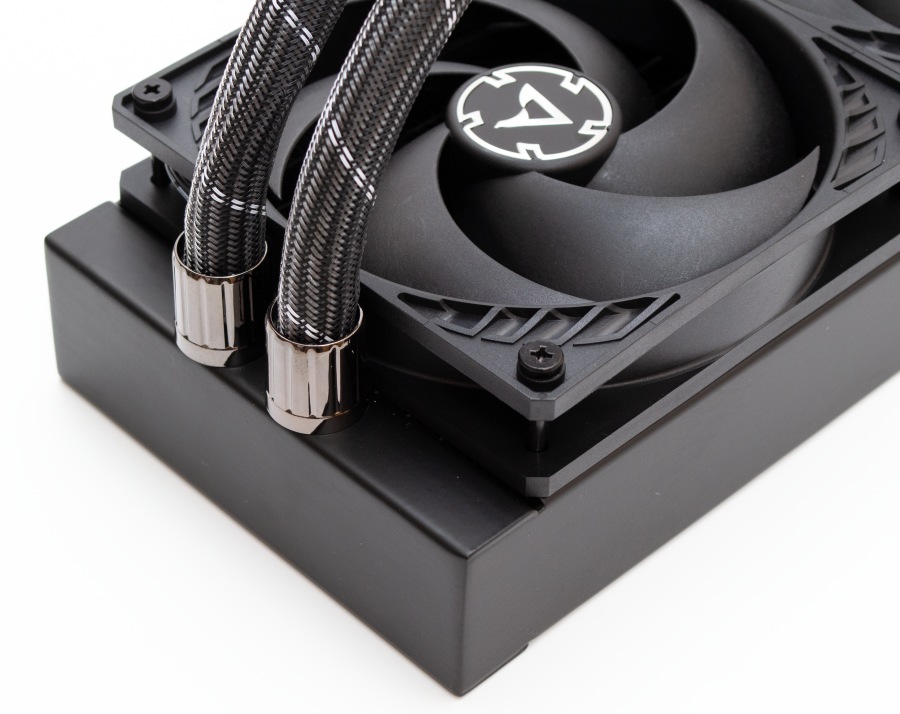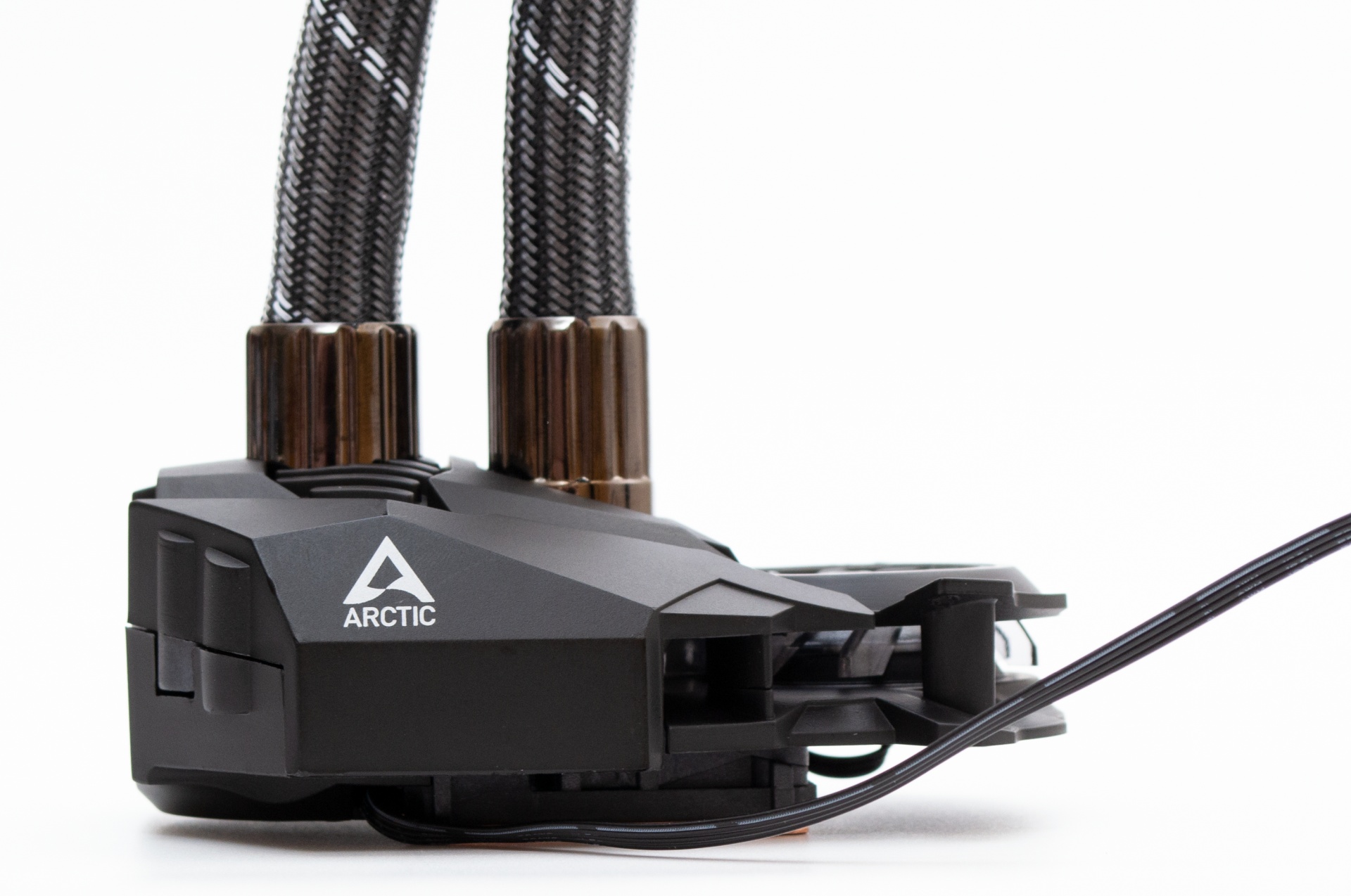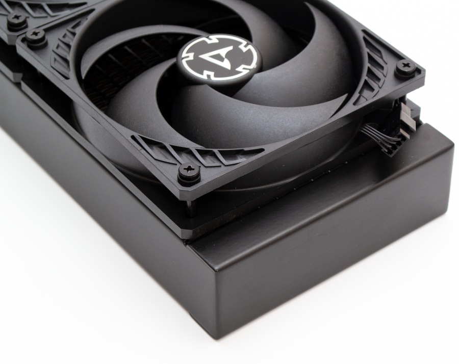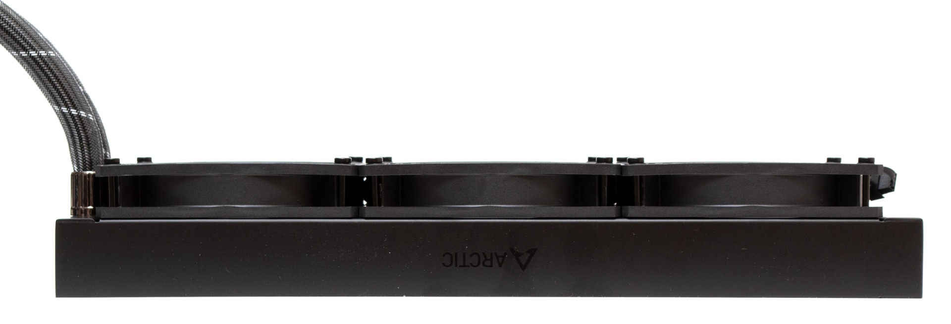 С обеих сторон радиатора, на цельных боковинах присутствует малозаметная надпись Arctic с логотипом перед ней. Обратите внимание, что радиатор в профиль имеет толщину в 38 мм против обычных 27 мм у изделий от Asetek. В сборе с вентиляторами суммарная толщина достигает 66 мм, потому стоит осторожно относиться к подбору корпуса для этой СЖО, чтобы избежать неожиданных конфликтов с другими компонентами.