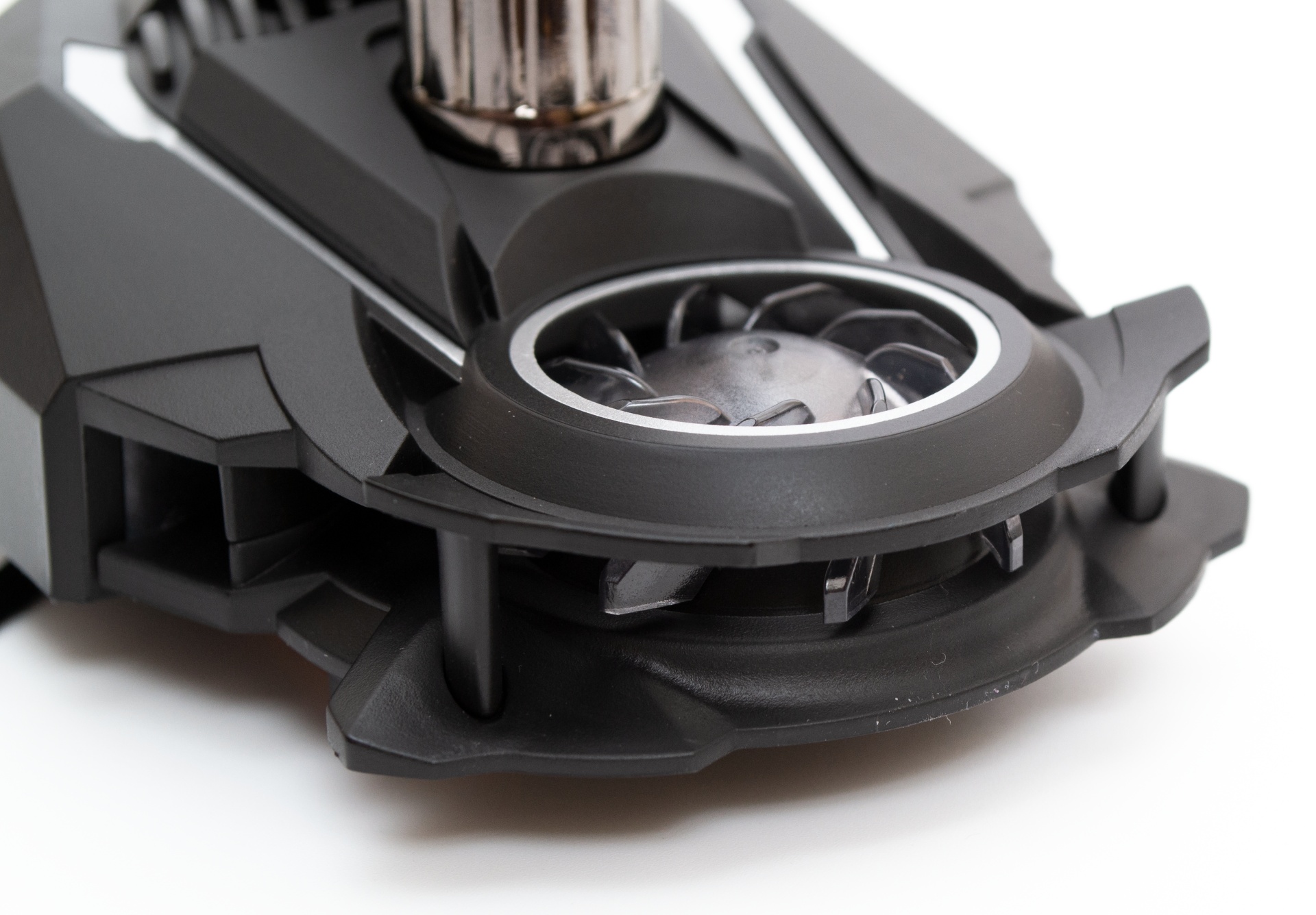 Вентилятор центробежного типа, диаметром 40 мм. Забирает воздух сверху и расталкивает в стороны, в радиусе 180 градусов. Его скорость управляется при помощи ШИМ в диапазоне от 1000 до 3000 об/мин. И если на минимуме он практически неразличим, то на полной скорости его уровень шума достигает 48 дБ (А), что заметно даже на фоне 120-мм пропеллеров.