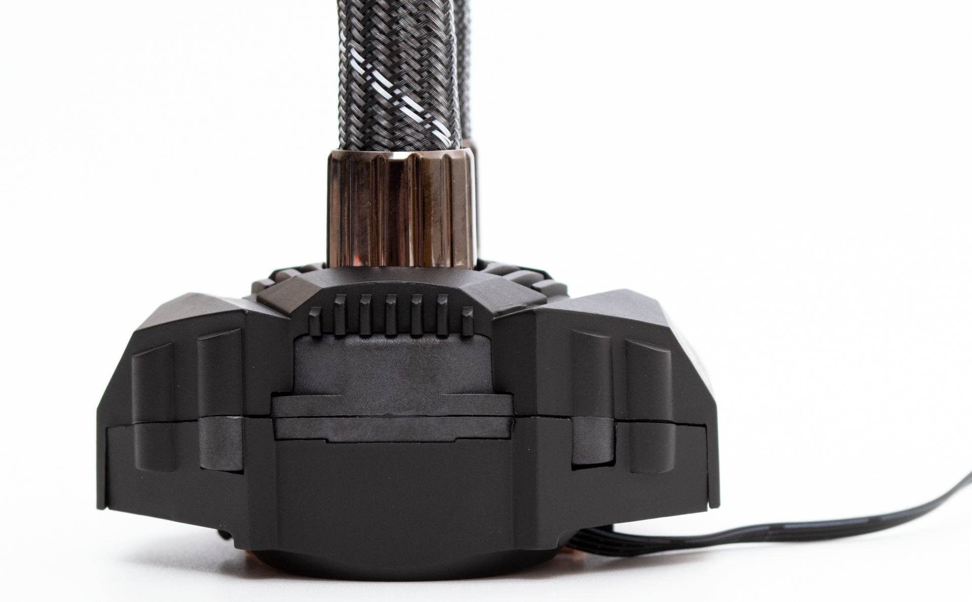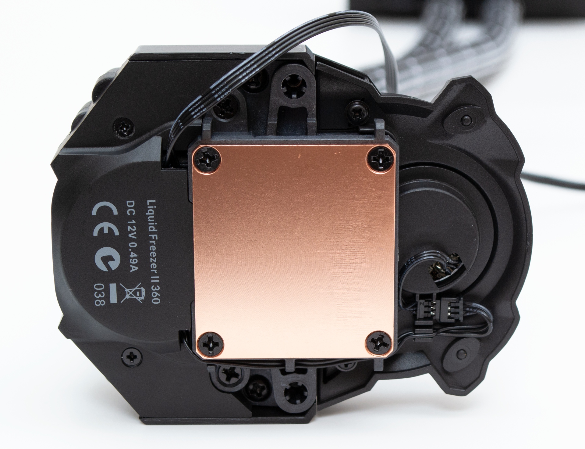 Ровная медная подошва имеет приближенную к квадратной форму со скругленными углами размером 40 х 44 мм. По углам находится всего четыре крепежных винта со стандартной крестовой шляпкой. Вдоль основания проложен провод подключения вентилятора цепей питания.