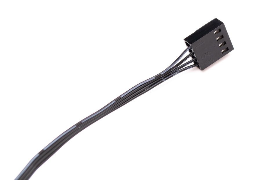 Питаются три основных вентилятора, помпа и дополнительный пропеллер через один общий четырехконтактный кабель длиной в 280 мм, который подключается в разъем CPU Fan материнской плате. Мониторинг скорости при этом осуществляется относительно 120-мм вентиляторов.