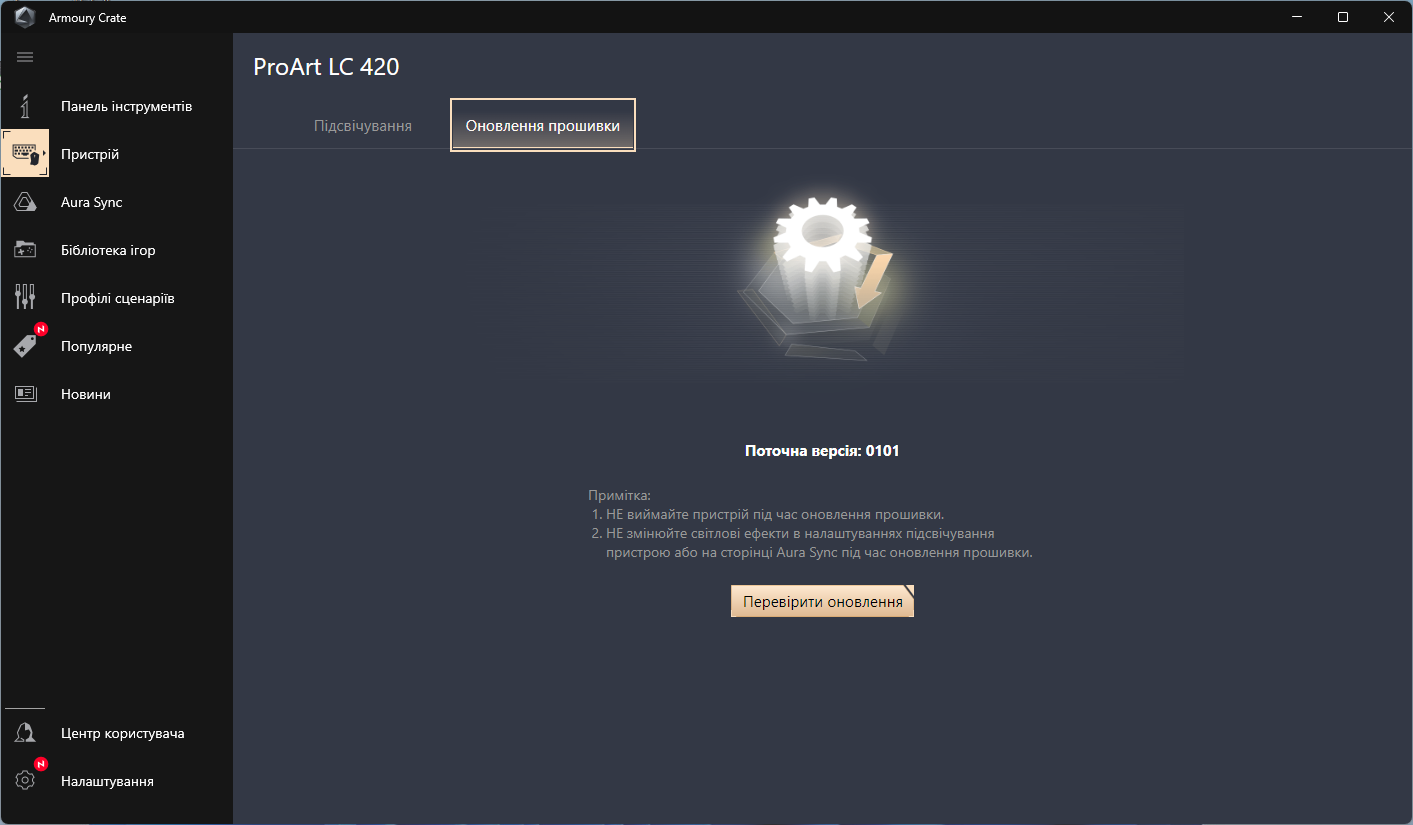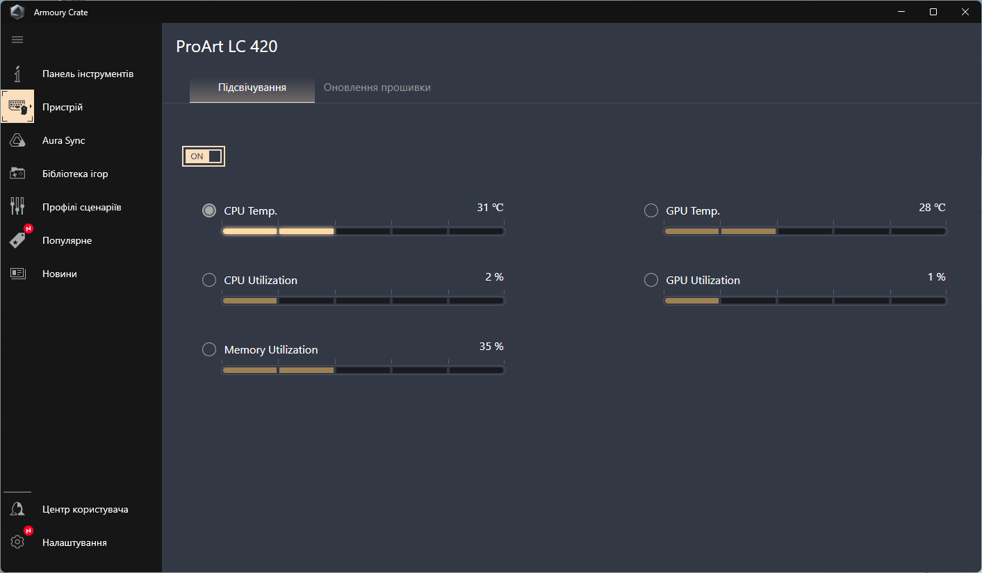 Для установки индикатора на водоблоке ASUS ProArt LC 420 использует фирменное приложение Armoury Crate. В интерфейсе несложно разобраться, все понятно интуитивно. Во вкладке устройств выбираем нашу СЖО, далее в меню «Подсветка» появятся пункты, доступные для мониторинга, можно выбрать только один из них или выключить индикацию вообще.