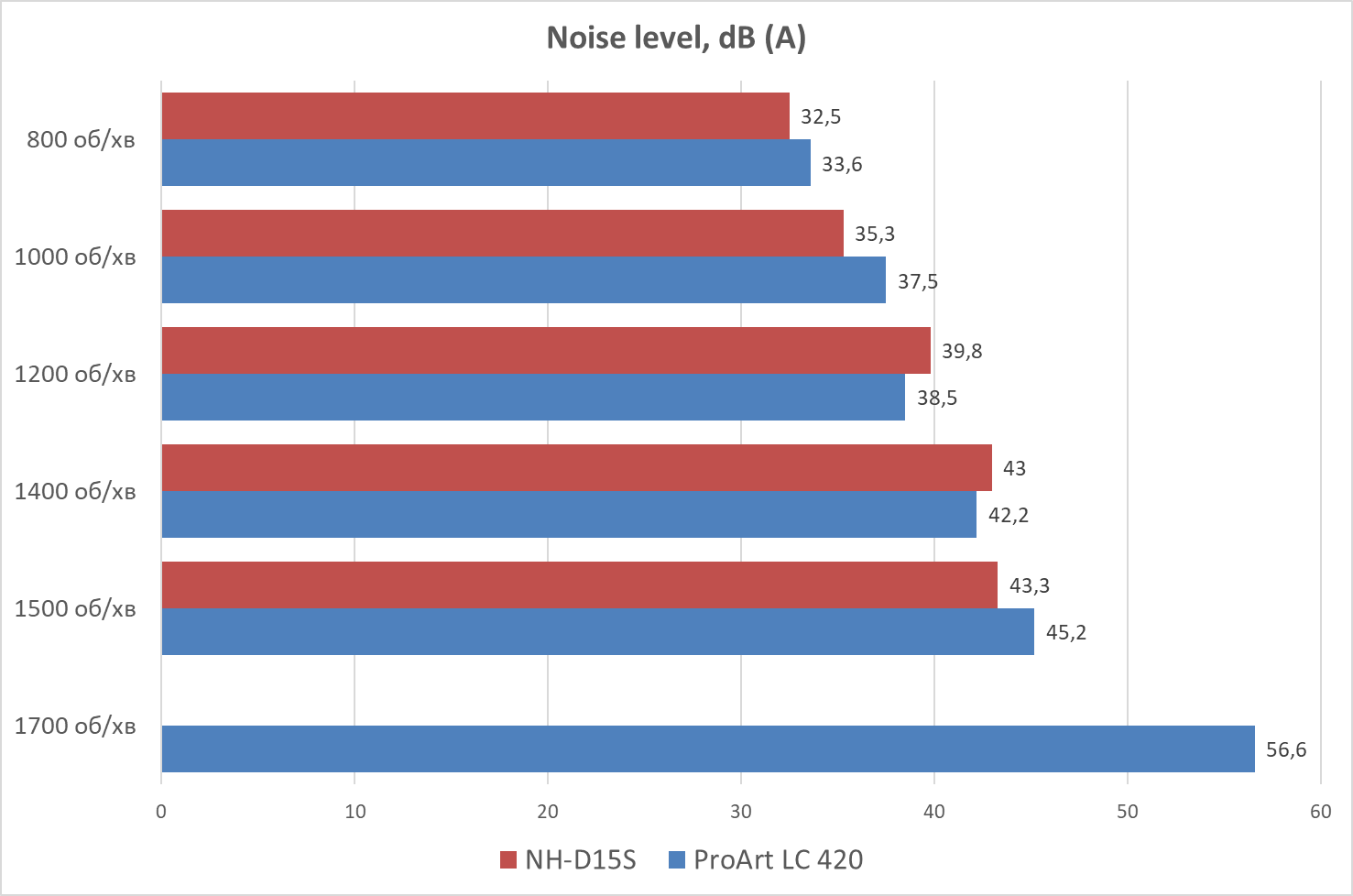 Все замеры произведены в тихом помещении без лишних источников шума. Шумомер был расположен в 30 см от вентиляторов и помпы. Уровень фонового шума составлял 27,7 дБ(А). Эффективность жидкостной системы охлаждения сравнивалась с двухсекционным воздушным охладителем Noctua NH-D15S с одним стоковым вентилятором и вторым дополнительным пропеллером Noctua NF-A15 PWM, максимальная скорость которого составляет 1200 об/мин.