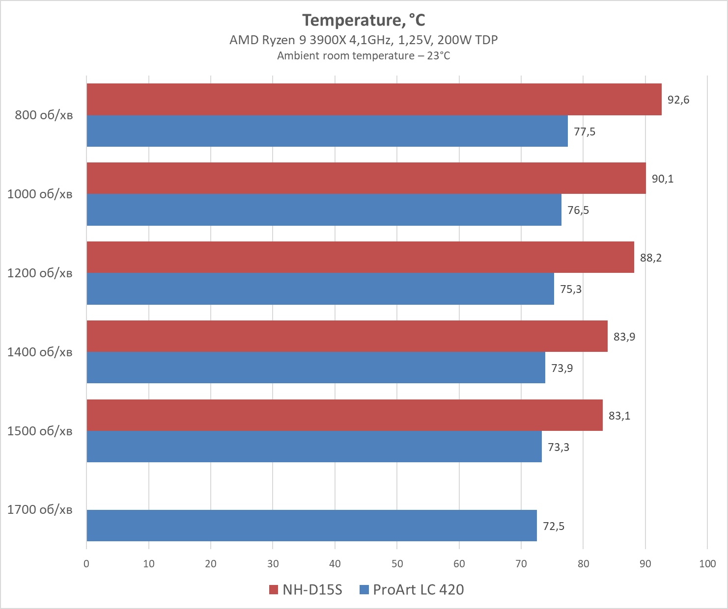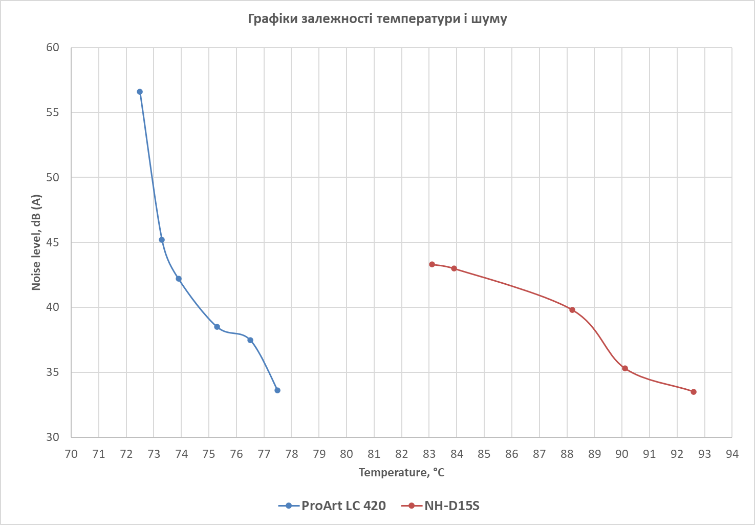 Системы охлаждения сравнивались по соотношению общей эффективности к уровню шума. Были установлены значения 1700, 1500, 1400, 1200, 1000 и 800 оборотов в минуту. Учитывая, что на Noctua один вентилятор максимально может вращаться на 1500 об/мин, а второй на 1200 об/мин, схема была следующей: 1500/1200, 1400/1200, 1200/1200, 1000/1000, 800/800.